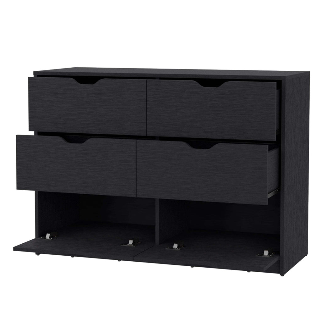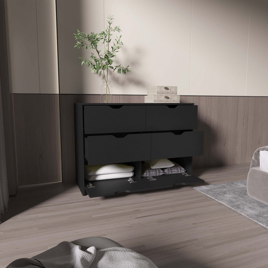 Introducing a 4-drawer dresser - a modern and sleek solution for organizing clothes and belongings with ease. Featuring four spacious drawers, two cabinets for additional storage, and an upper surface for displaying decorations, this dresser combines contemporary style with practical functionality, making it a must-have for any bedroom in need of organization and elegance.