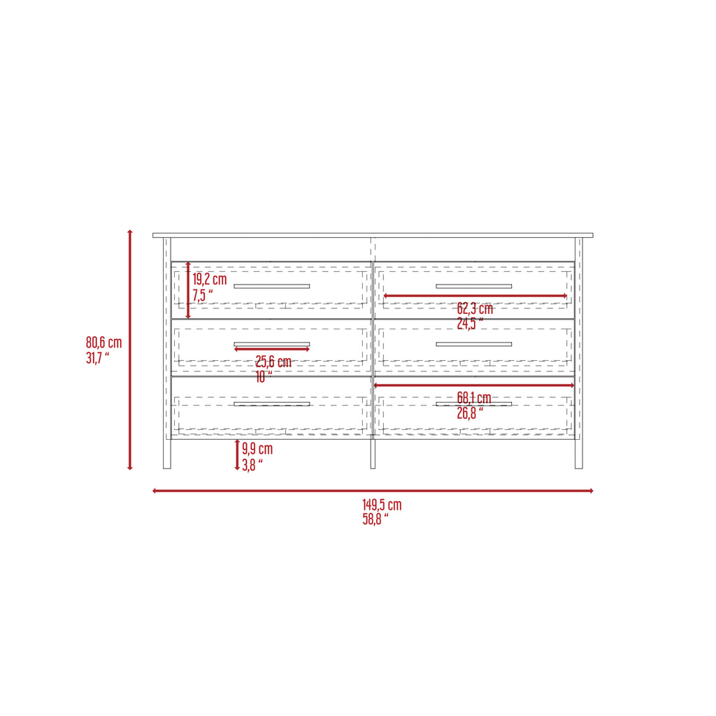 This piece features six large drawers for ample storage of clothing, accessories, or other personal items, with sleek black metal pulls that enhance modern elegance and ease of use. The wengue finish provides a stylish, contemporary look by blending dark and light tones, while the rectangular shape ensures a classic, versatile design that fits seamlessly into a variety of spaces.