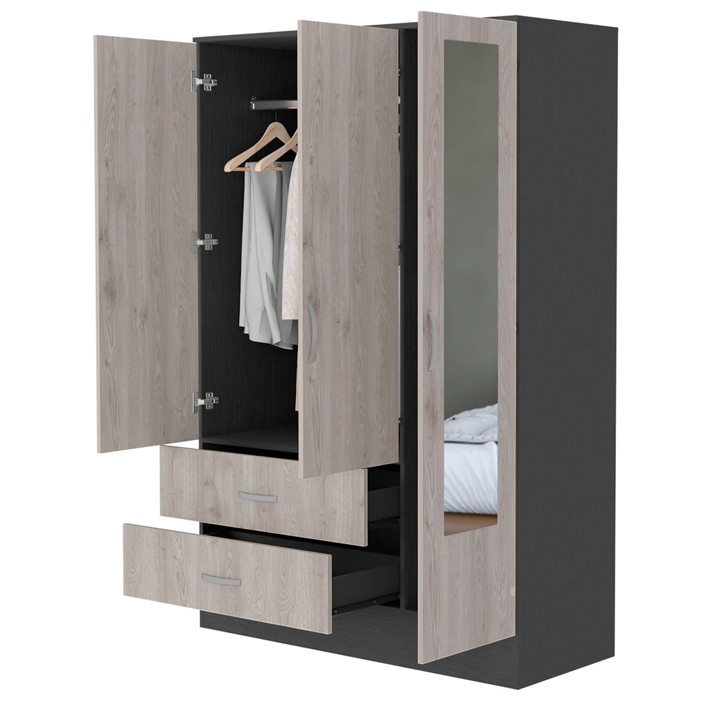 A full-length mirror adds stylish appeal to this two-drawer armoire in a compelling black and light oak finish. A two-door cabinet includes a hanging bar while a side cabinet and two drawers are ideal for organizing folded clothing, linens, and accessories.