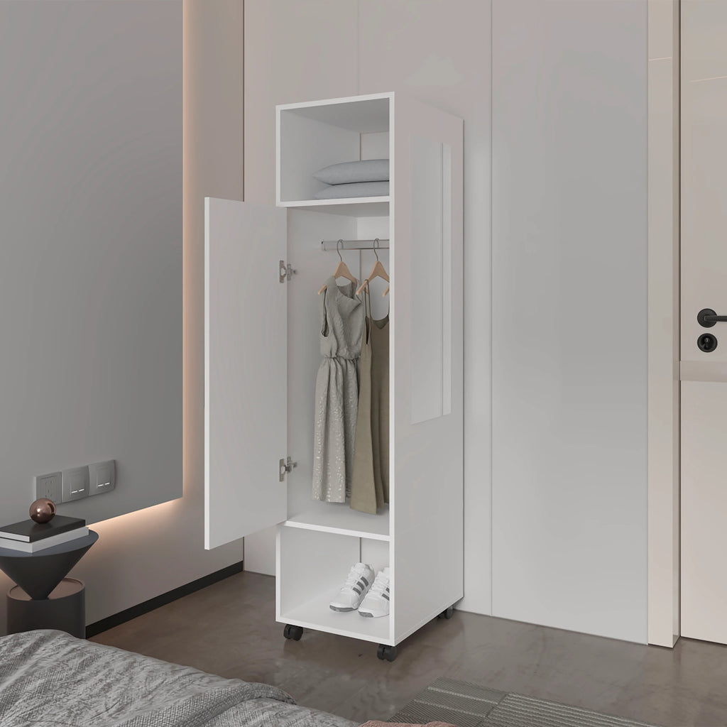 This stylish and functional closet offers open storage for easy access to clothing and accessories, while an integrated mirror adds practicality and saves space. With a door for concealed storage, its sleek, modern design in melamine blends seamlessly into any décor, making it an essential addition for organization and style in any bedroom.
