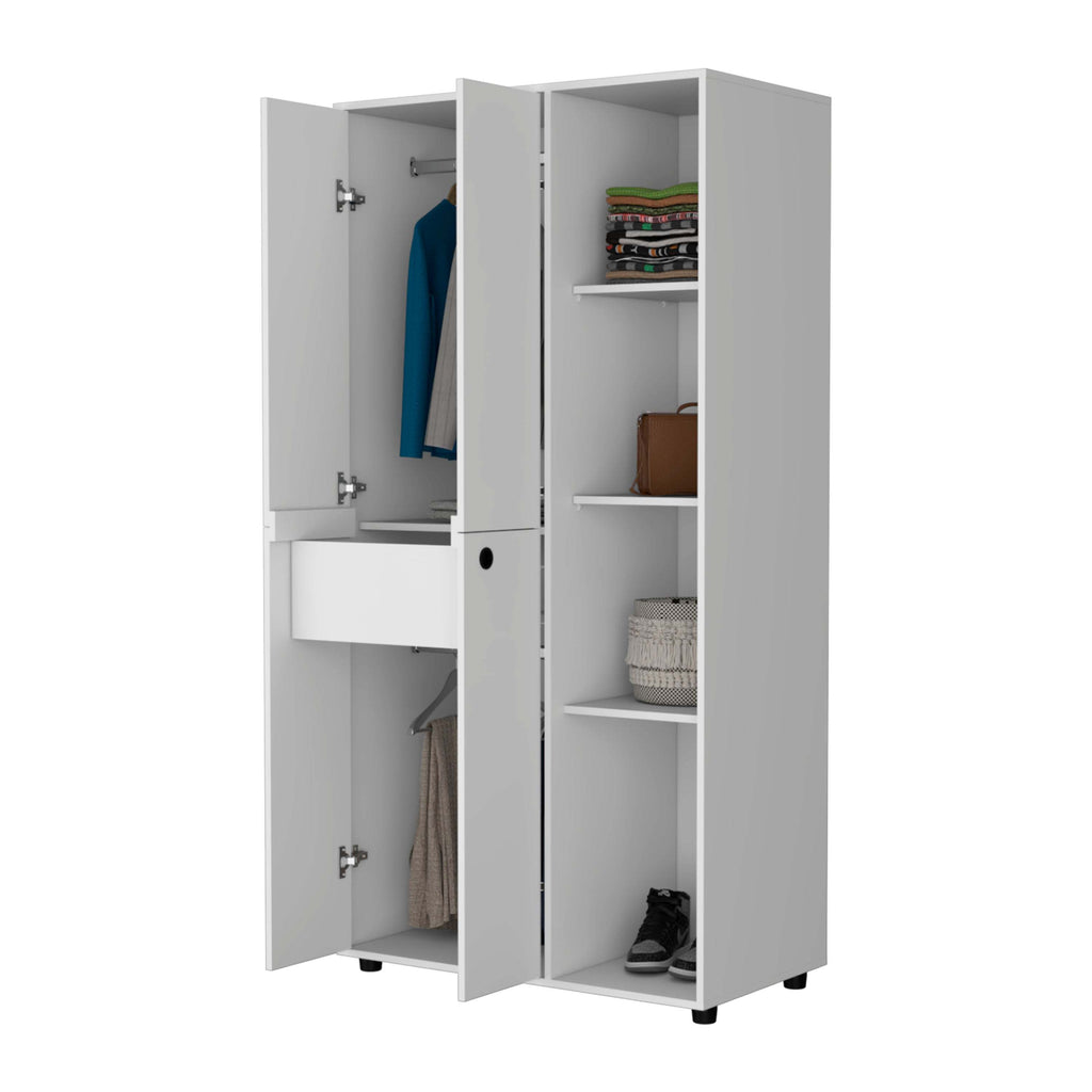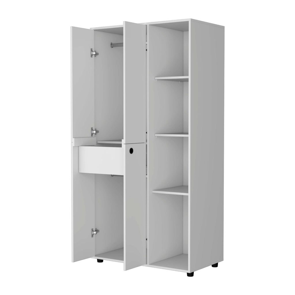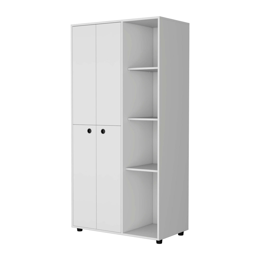 With its slim design featuring four doors, two hanging rods, four open storage cabinets, this armoire offers ample storage while complementing your style with options in white or black manufactured wood finishes. Perfect for small spaces, this armoire provides efficient organization without sacrificing storage capacity, making it an ideal addition to any room.