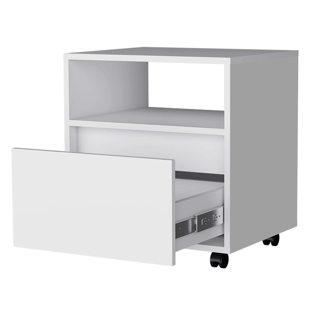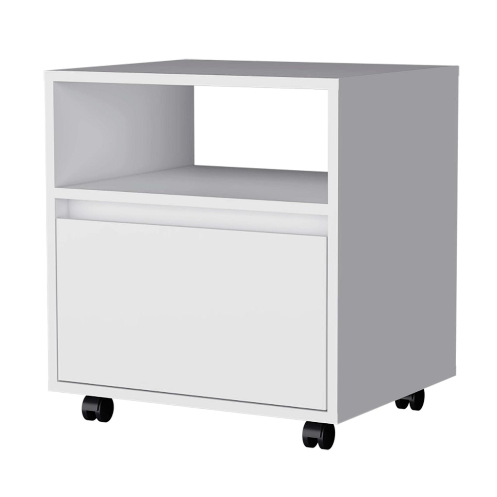 Introducing the versatile nightstand, designed for the contemporary individual with a dynamic lifestyle. Featuring an open-top shelf for easy access, a spacious drawer for secure storage, and convenient casters for effortless mobility, this nightstand combines practicality with witty style, to complement any modern decor.