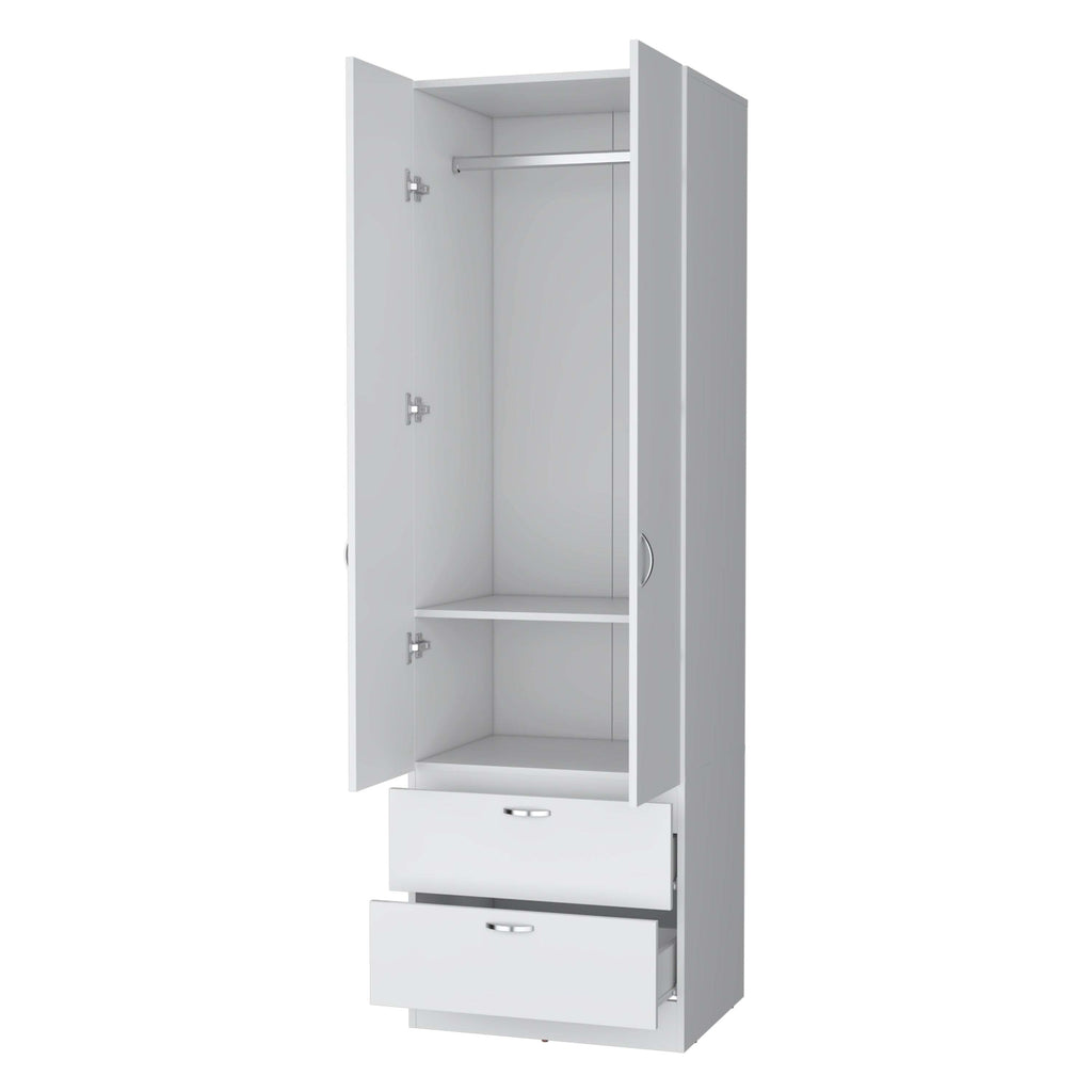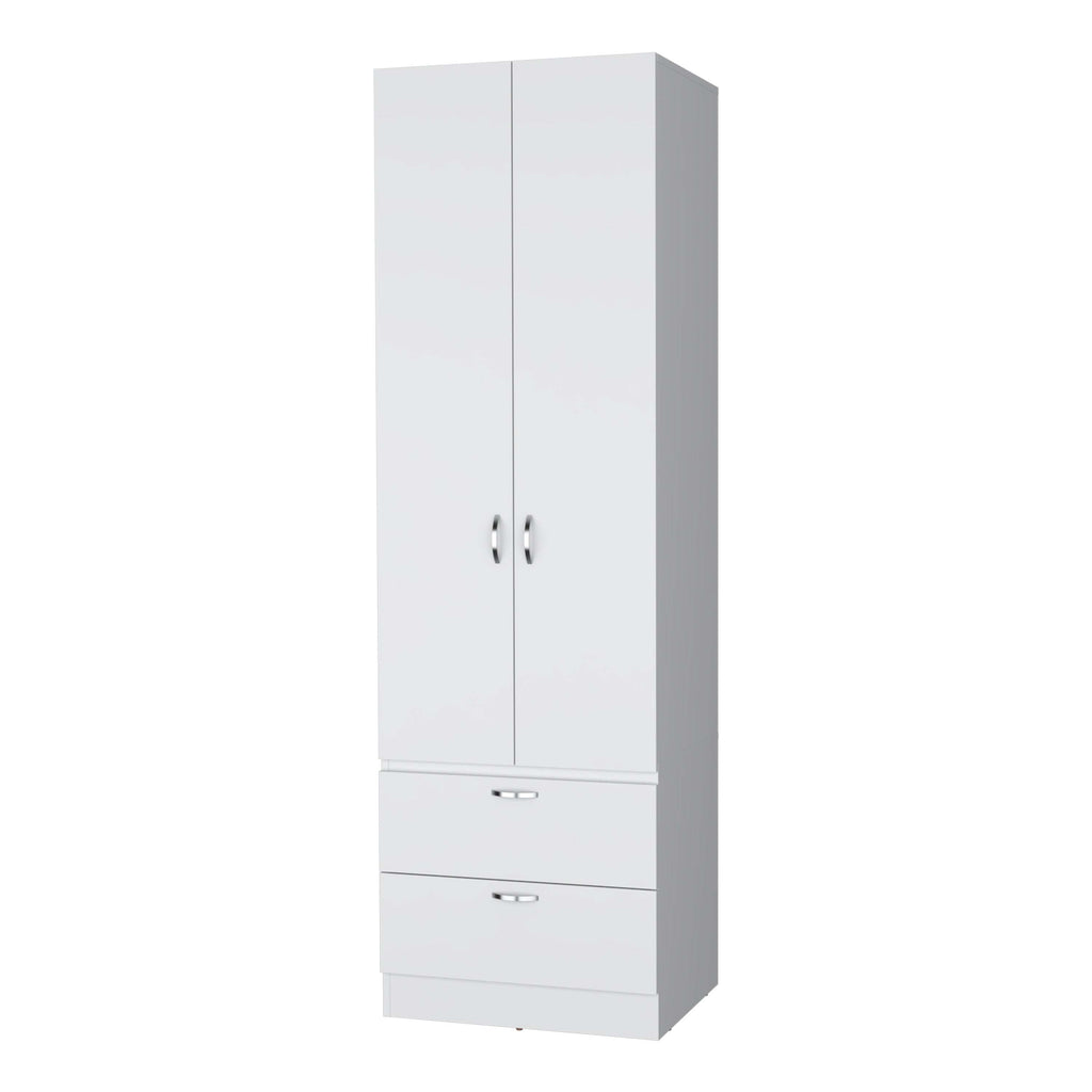 - Featuring two doors, two drawers, and a hanging rod, it offers ample storage space for both adult and children's clothing