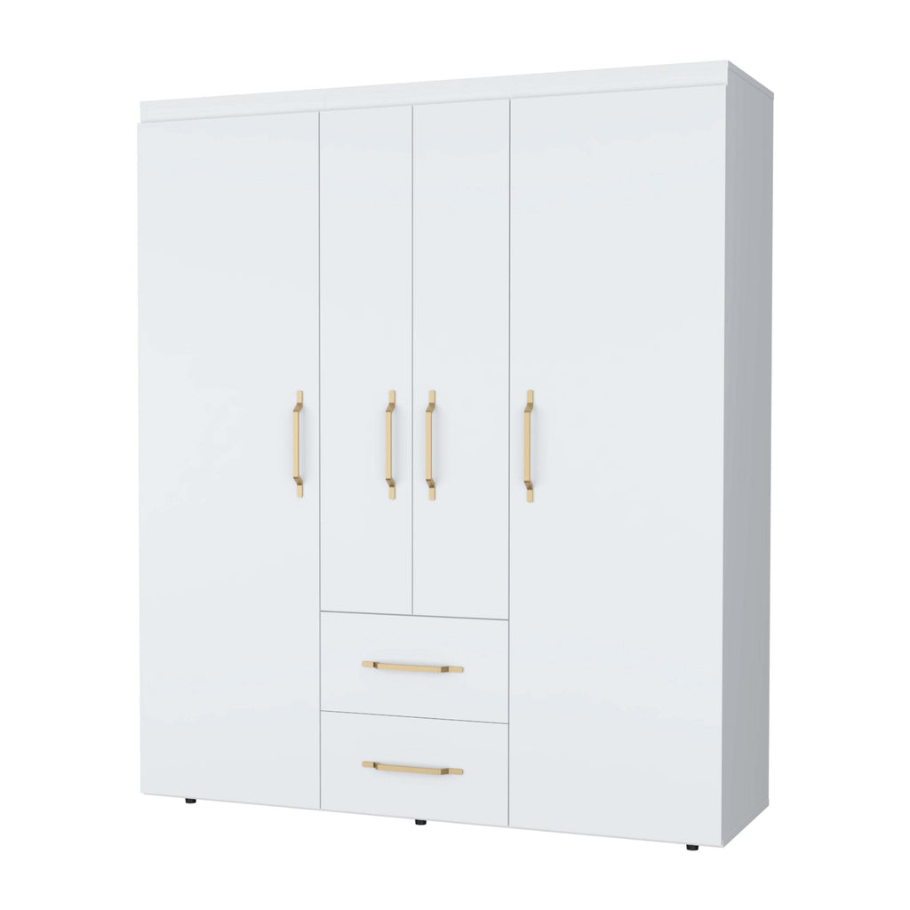 Presenting the refined wardrobe, where style seamlessly integrates with functionality. Featuring graceful side doors for hanging attire and a generous double-door compartment with shelving, paired with two drawers for accessories, it's the perfect fusion of fashion and practical design.