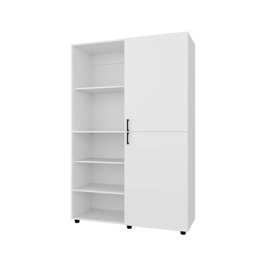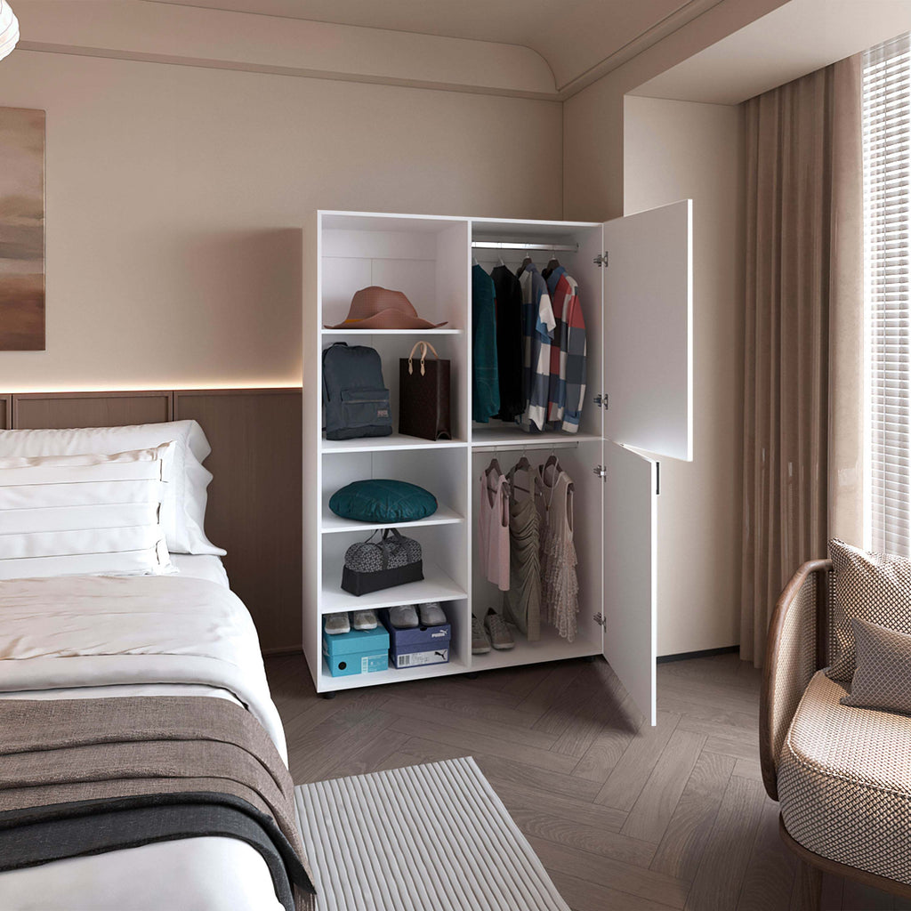 This white wardrobe combines concealed compartments behind two doors with open sections for quick access, offering both hidden and display storage options. Crafted from durable materials with a clean finish, it brightens the bedroom while maintaining a modern, space-efficient design.