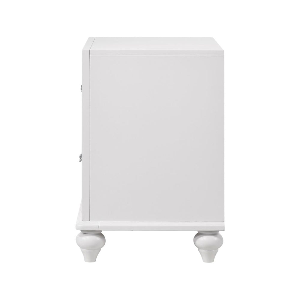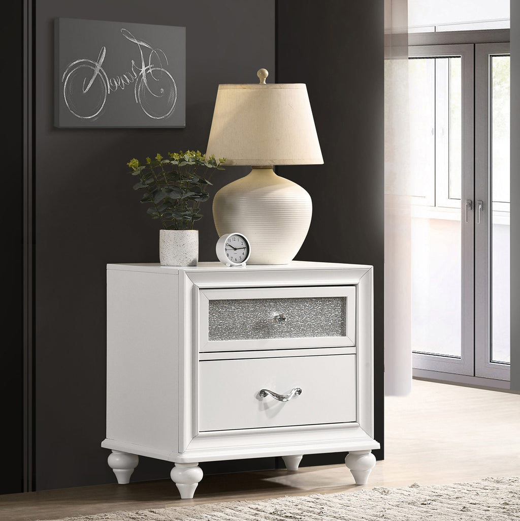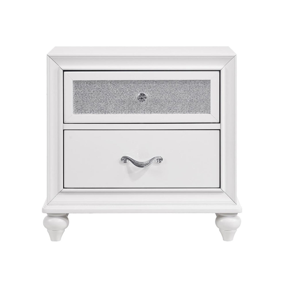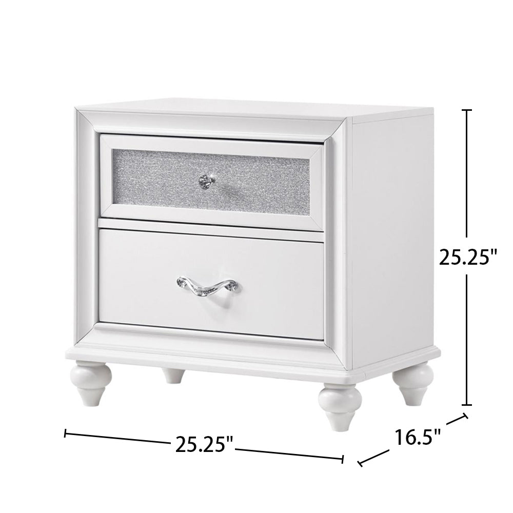Exquisitely crafted for style and versatility, this glamorous two-drawer nightstand is perfect for an elegant bedroom. The faceted crystal hardware glistens and gleams. The glittery acrylic panels sparkle and shine against the clean, classic white finish. Equipped with two drawers for your storage convenience, this stunning, modern nightstand keeps a bedside organized in style.