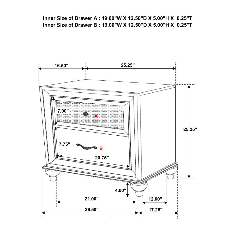 - Equipped with two drawers for convenient bedside storage