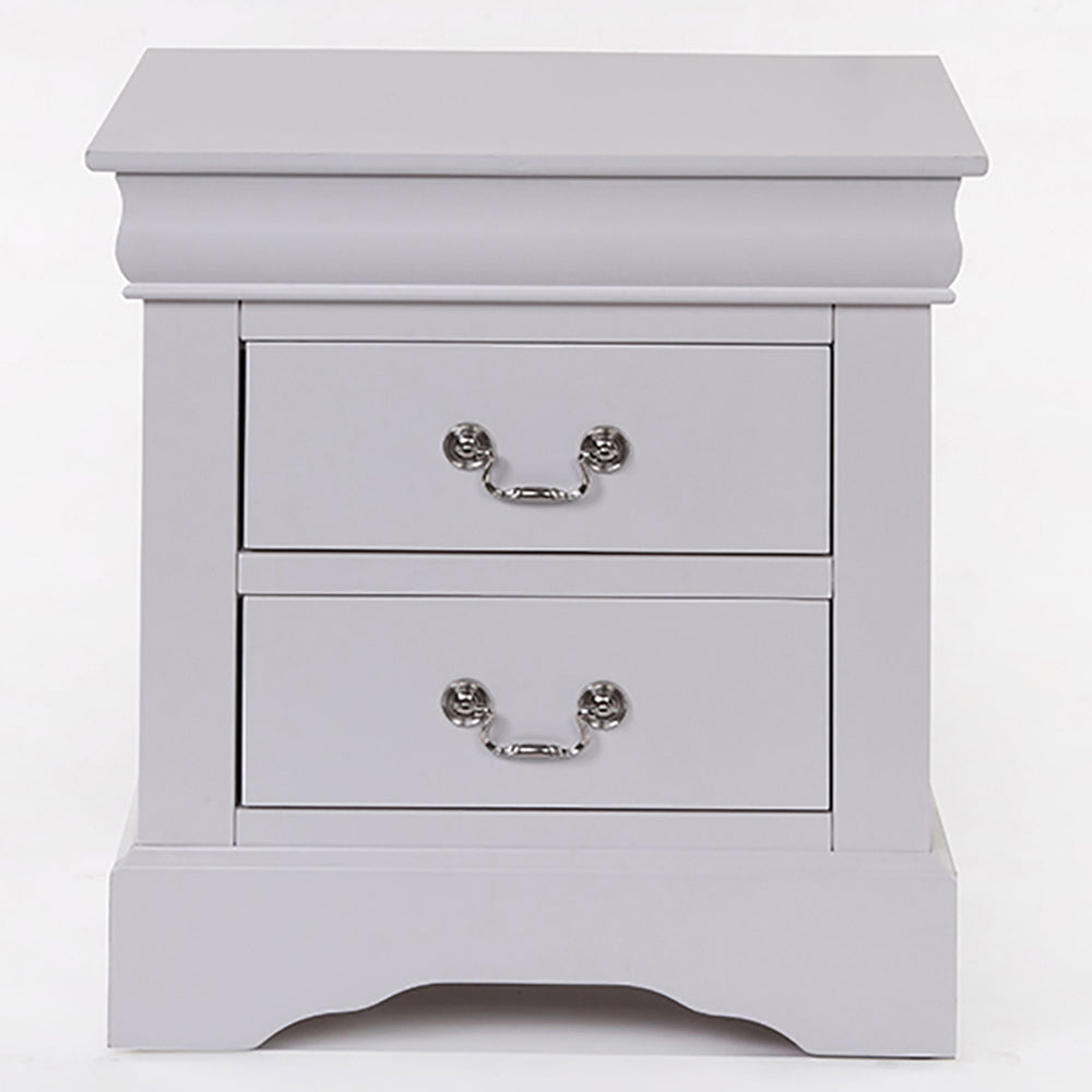 The nightstand features two drawers, providing convenient storage for bedside essentials and personal items, with center metal drawer glides using the Kenlin system for smooth 2/3 extension operation. The drawers, constructed with dovetail joints on the French back for durability and stability, are adorned with metal handles that add a touch of elegance to the overall design.
