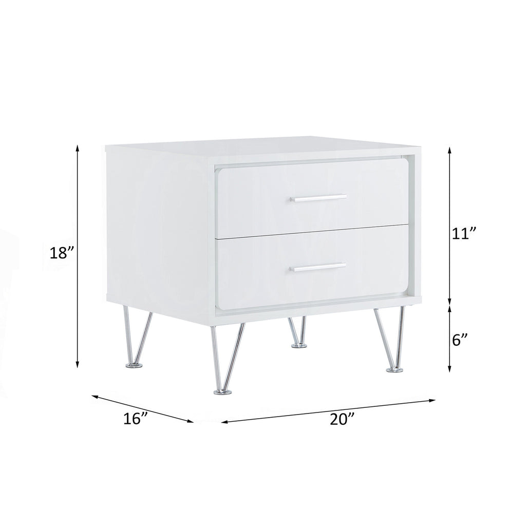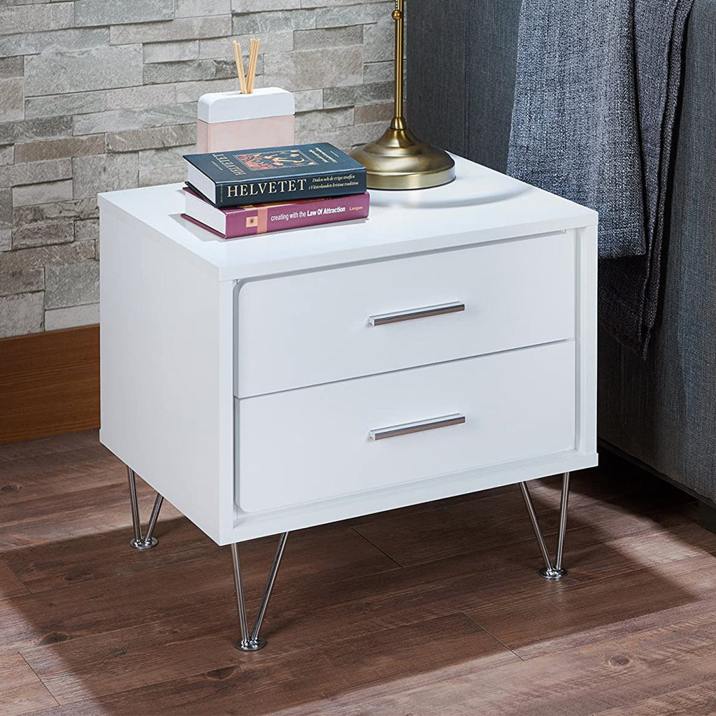 The nightstand features a unique leg design and is functional as an end table too. The chrome legs add a lot of modern style and will be a great additional to your bedroom. The 2 drawers of the small table offer large storage space for nighttime necessities. Made of high-quality materials, it demonstrates delicate craftsmanship and has the perfect design to enhance your room.