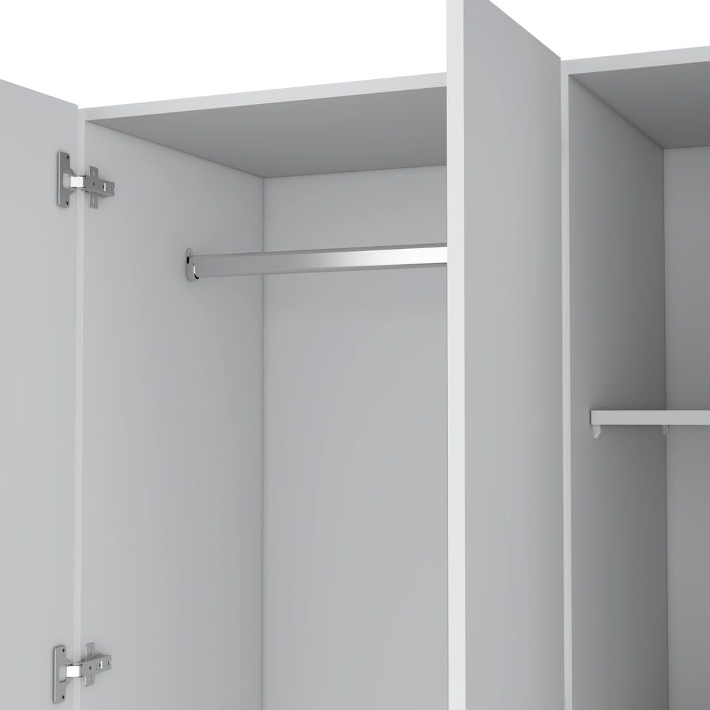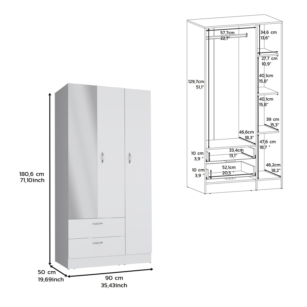 - 3 doors, 2 drawers, 4 wheels, 5 shelves and 1 mirror