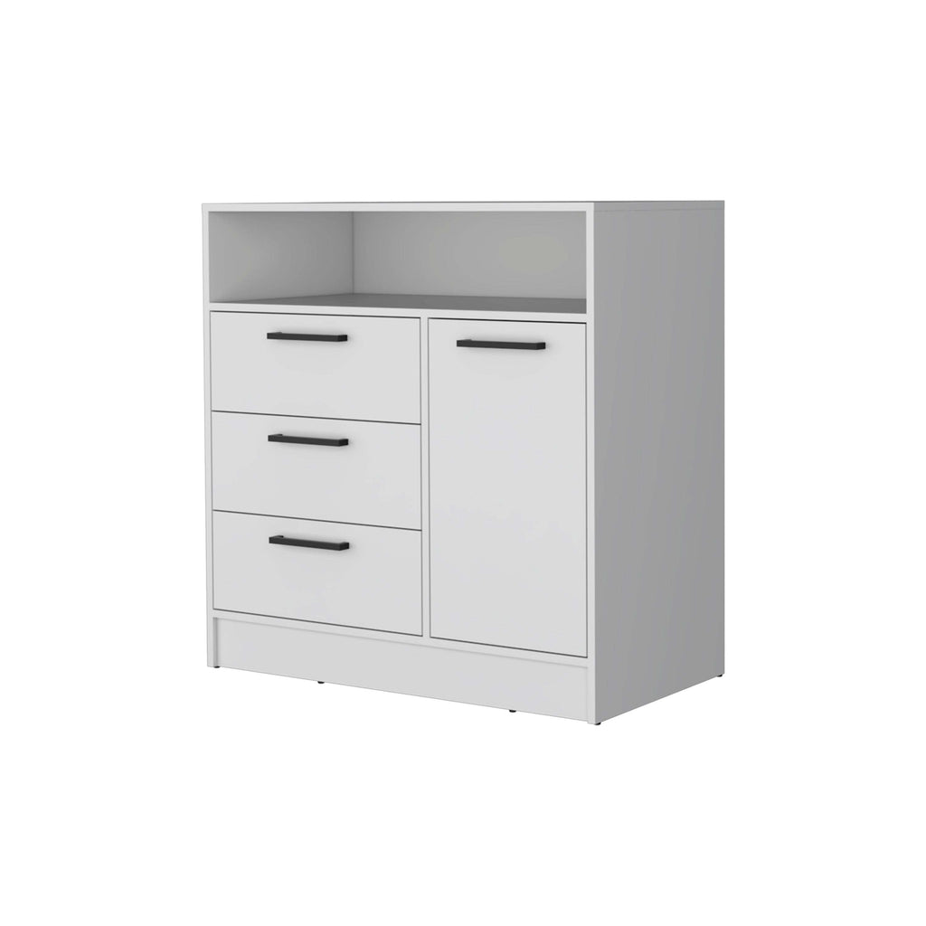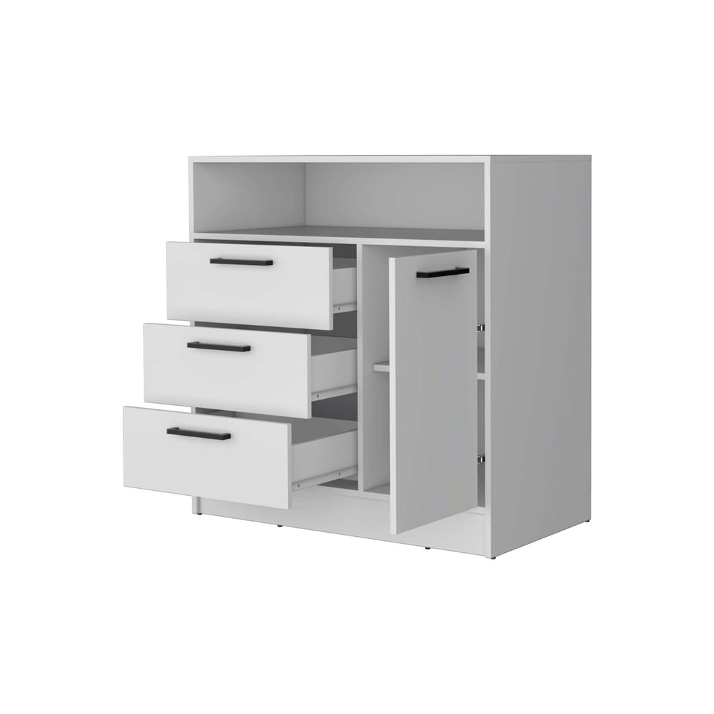 Featuring three spacious drawers and a single-door cabinet with inner storage shelves, this dresser offers ample storage space for small items, while the top open shelf provides additional surface space for decorating with plants or knick-knacks. Crafted from durable manufactured wood, the dresser combines beauty and longevity, making it a timeless addition to any room.