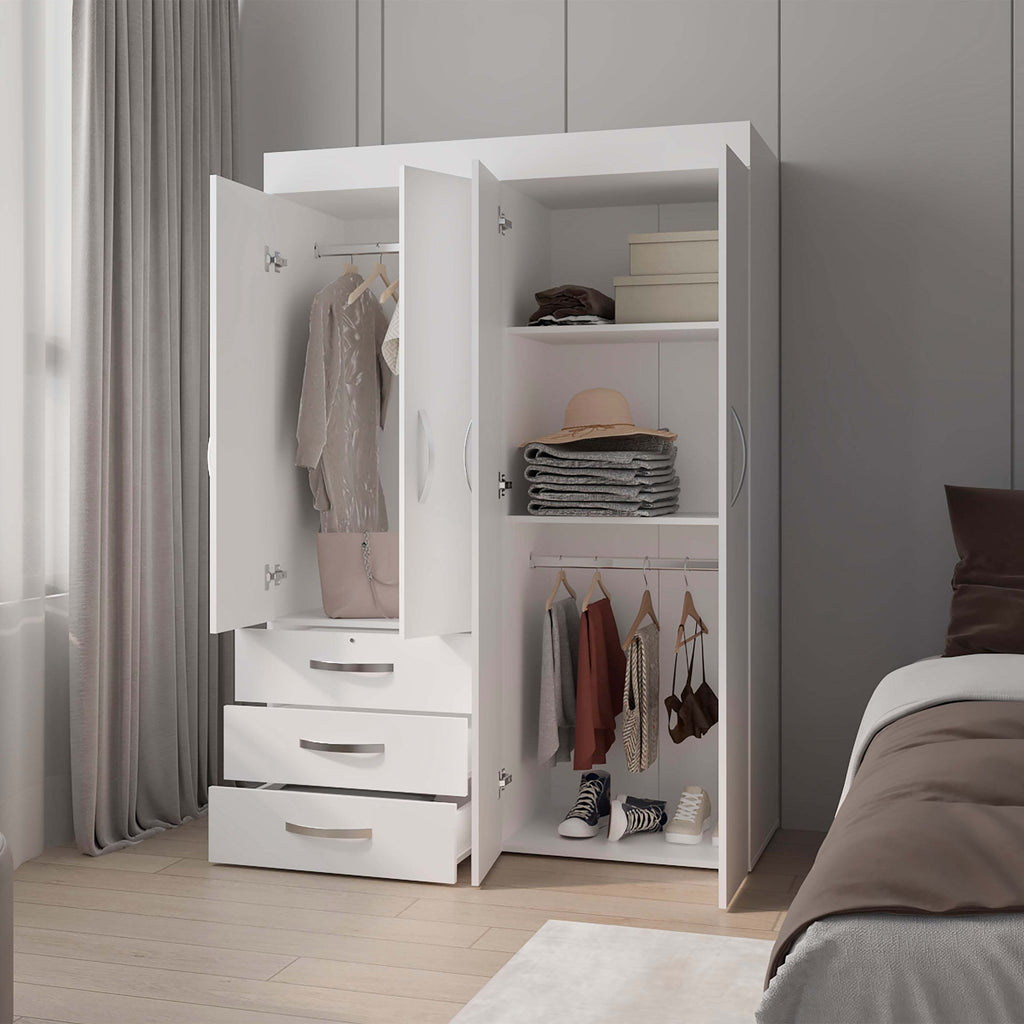 This piece offers ample concealed storage with its 4-door design, perfect for organizing household essentials while maintaining a sleek appearance. With 3 practical drawers and 2 interior shelves, it provides versatile storage solutions, all finished in crisp white for a clean, timeless aesthetic that complements various interior styles.