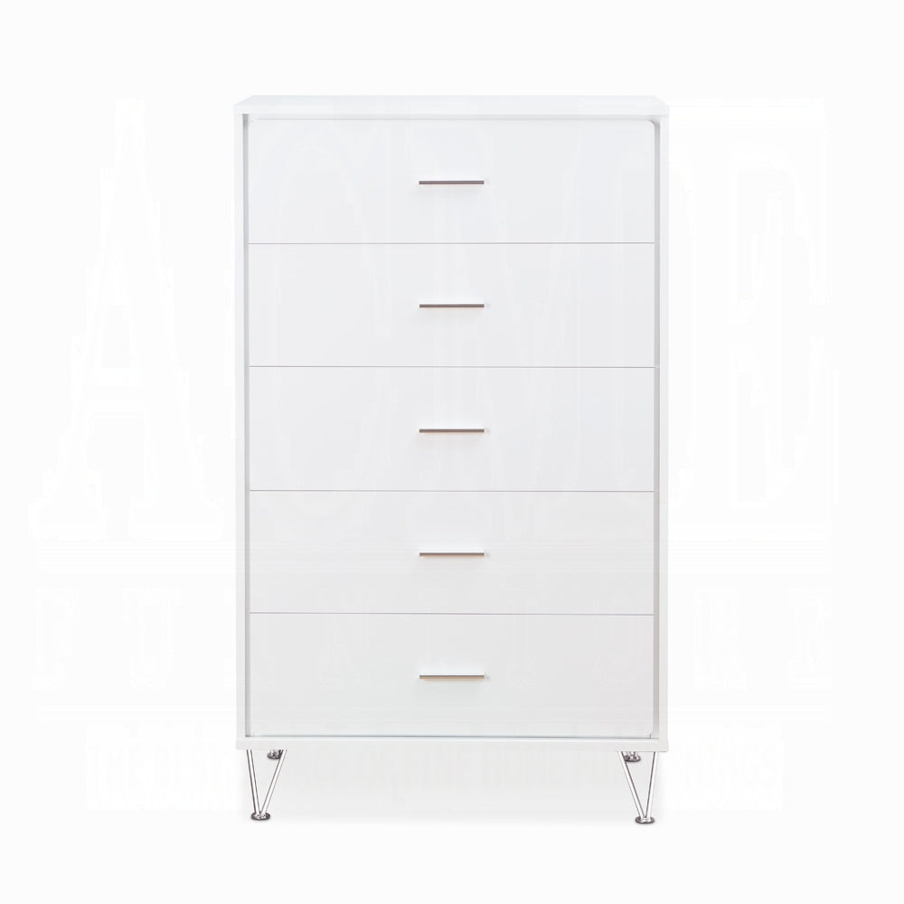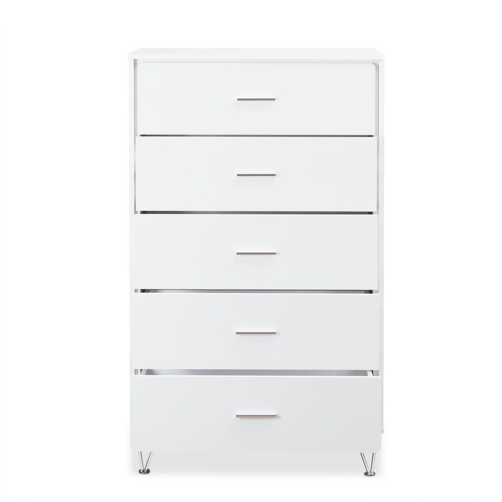 - Featuring 5 drawers, a durable wooden case-frame, and chic chrome-finished metal legs, this item is equipped with side metal glide drawers for convenient organization