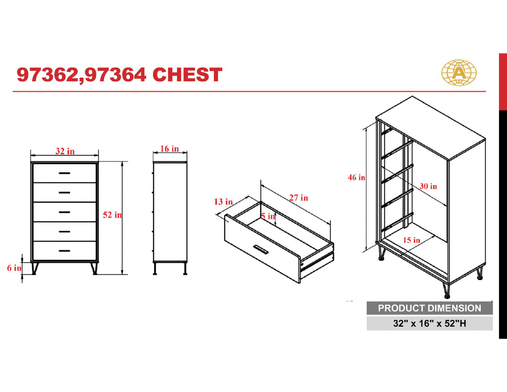 - This piece combines 5 spacious drawers, a solid wooden case-frame, and stylish chrome-finished metal legs, along with side metal glide drawers for effortless operation