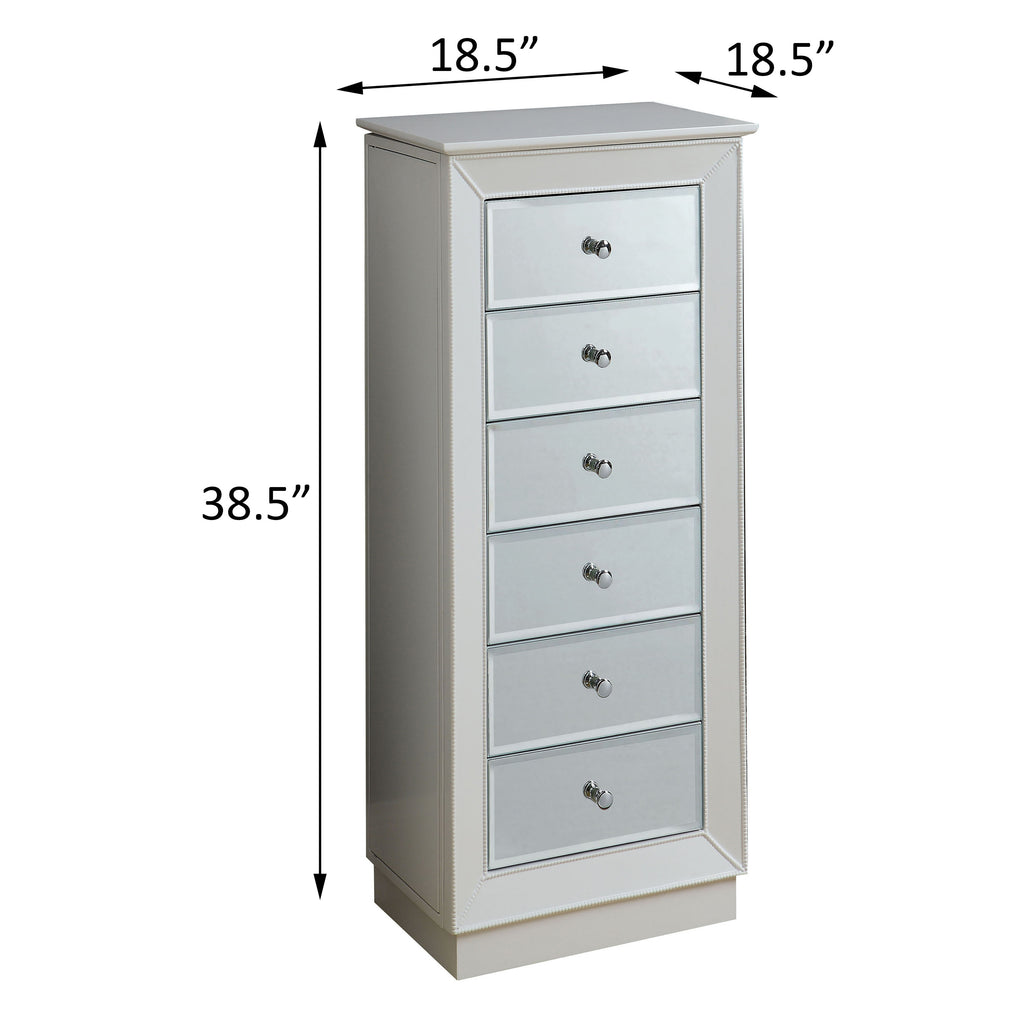 This modern jewelry armoire offers stylish and organized storage with six drawers and dedicated compartments, including a built-in mirror and hooks for hanging necklaces and bracelets. Its felt-lined drawers provide protection for delicate jewelry, making it an ideal addition to bedrooms, dressing rooms, or walk-in closets for convenient and elegant organization.