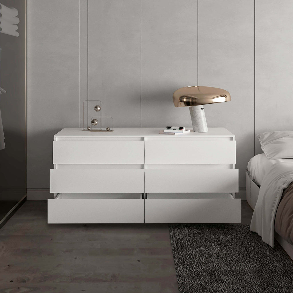The six drawers offer extensive storage, ideal for organizing a variety of items and maintaining a tidy space, with metal drawer rails ensuring smooth and durable operation. The classic rectangular shape and clean white finish enhance the sense of space and versatility, making it a stylish and functional addition to any room.