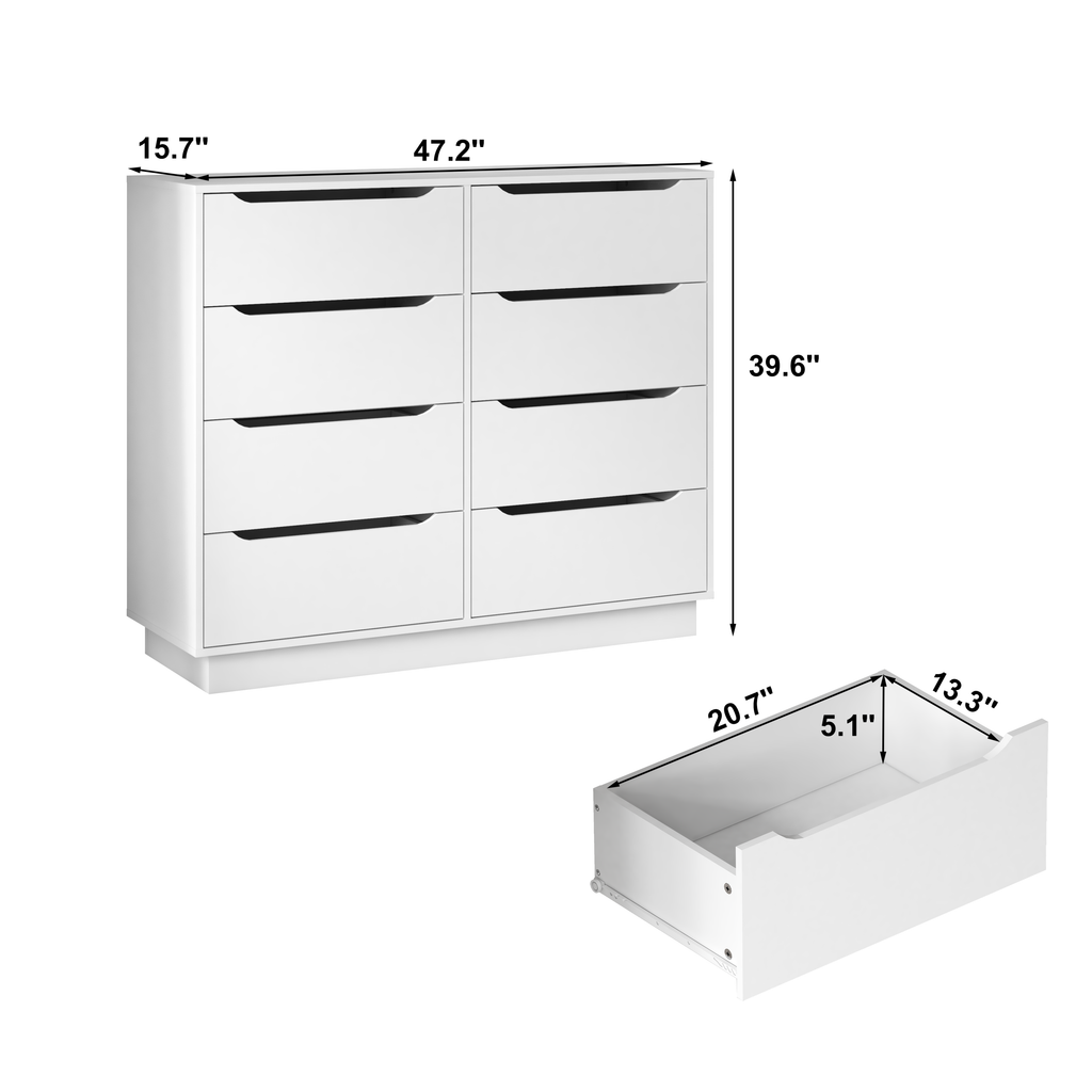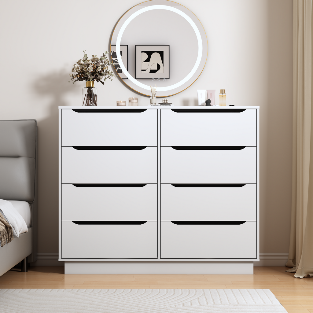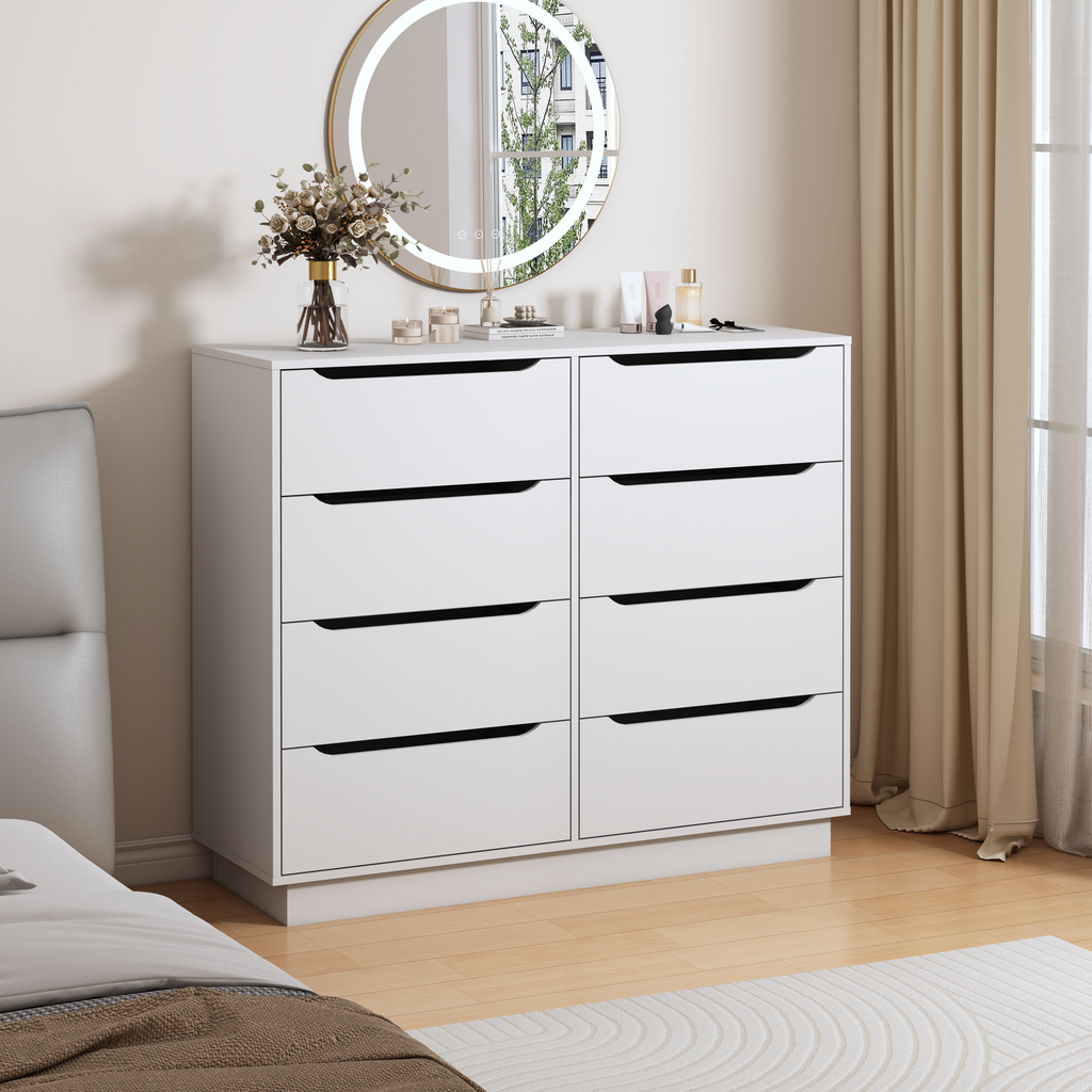 - 【Versatile Drawer Chest】:Large capacity 8 drawer double dresser can be put in any corner of the home to play a role. Store clothes or blankets in the bedroom, organize books and sundries in the living room, place documents in the home office, or use them as a makeup cabinet. This practical and beautiful cabinet is a great gift for family or friends!