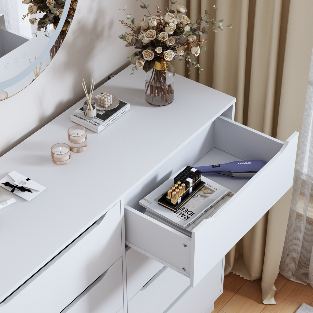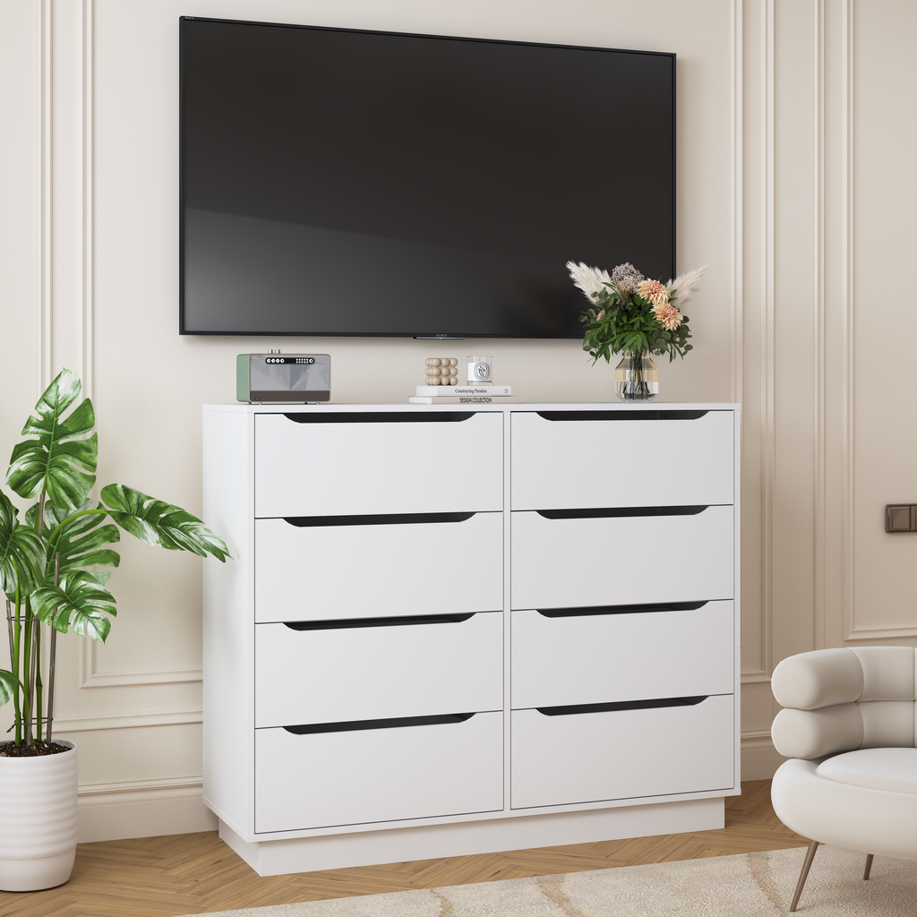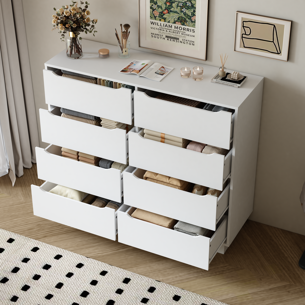 - 【Versatile Drawer Chest】:Large capacity 8 drawer double dresser can be put in any corner of the home to play a role. Store clothes or blankets in the bedroom, organize books and sundries in the living room, place documents in the home office, or use them as a makeup cabinet. This practical and beautiful cabinet is a great gift for family or friends!