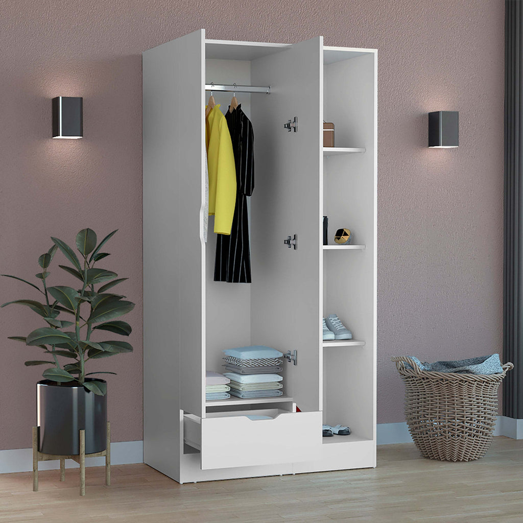 - The large 2-door cabinet provides ample storage space, complete with a sturdy hanging rod for keeping your clothes organized and easily accessible.