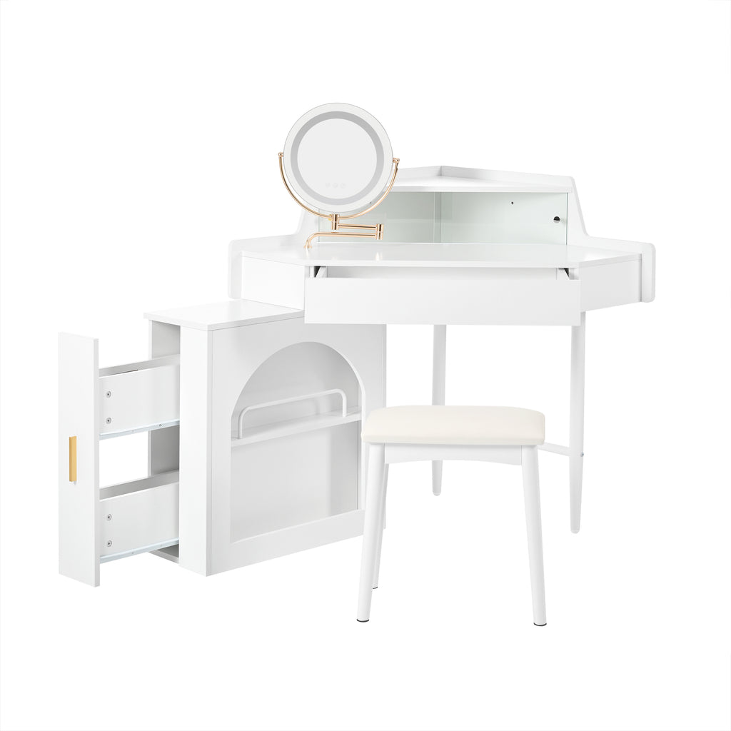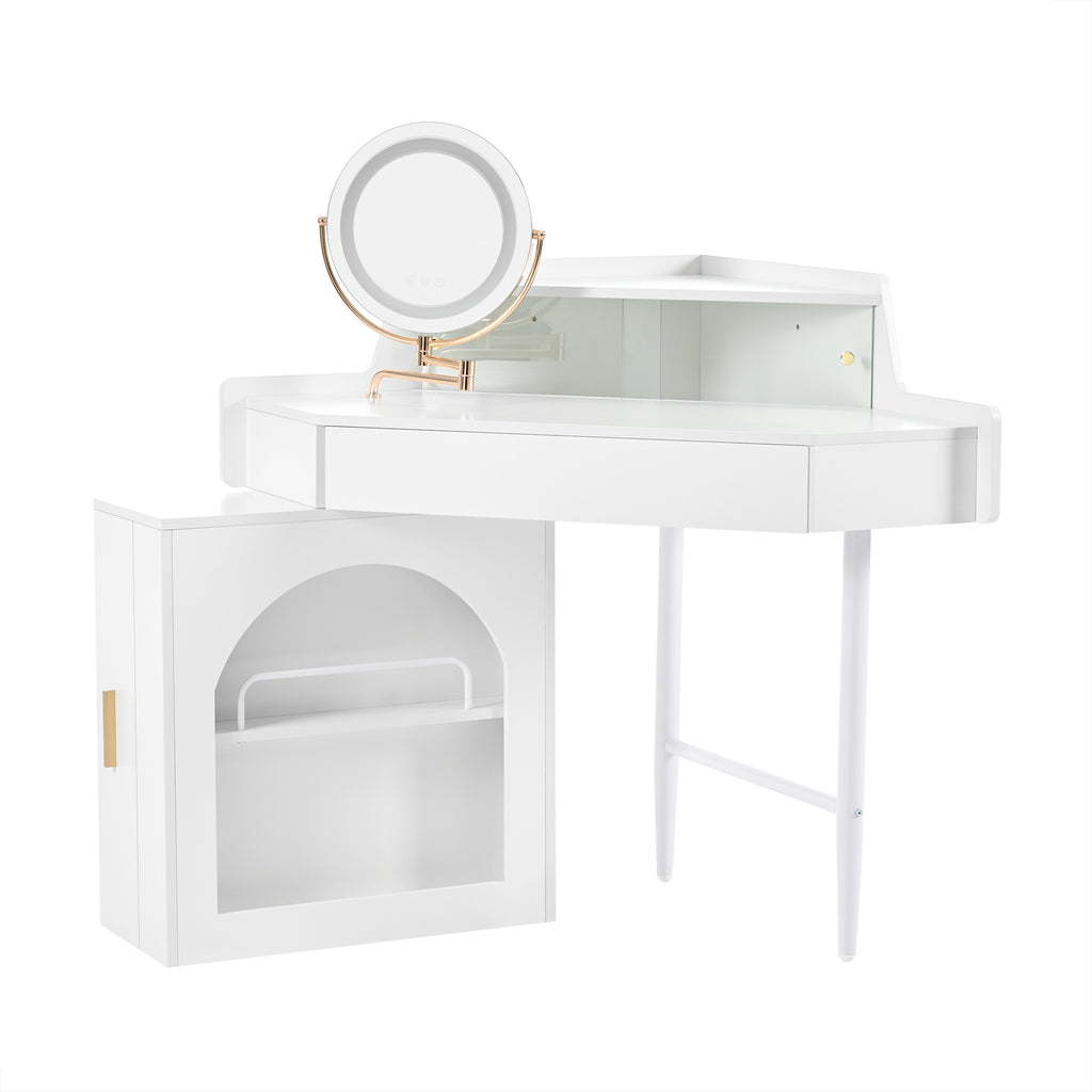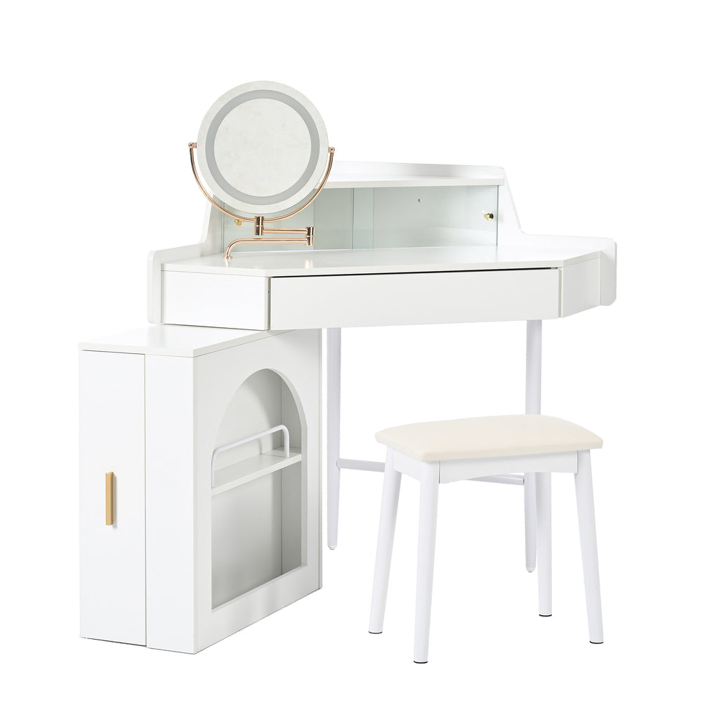 The dresser has a unique full angle rotating makeup mirror, which 3-color adjustable LED light, which meets your different makeup needs.