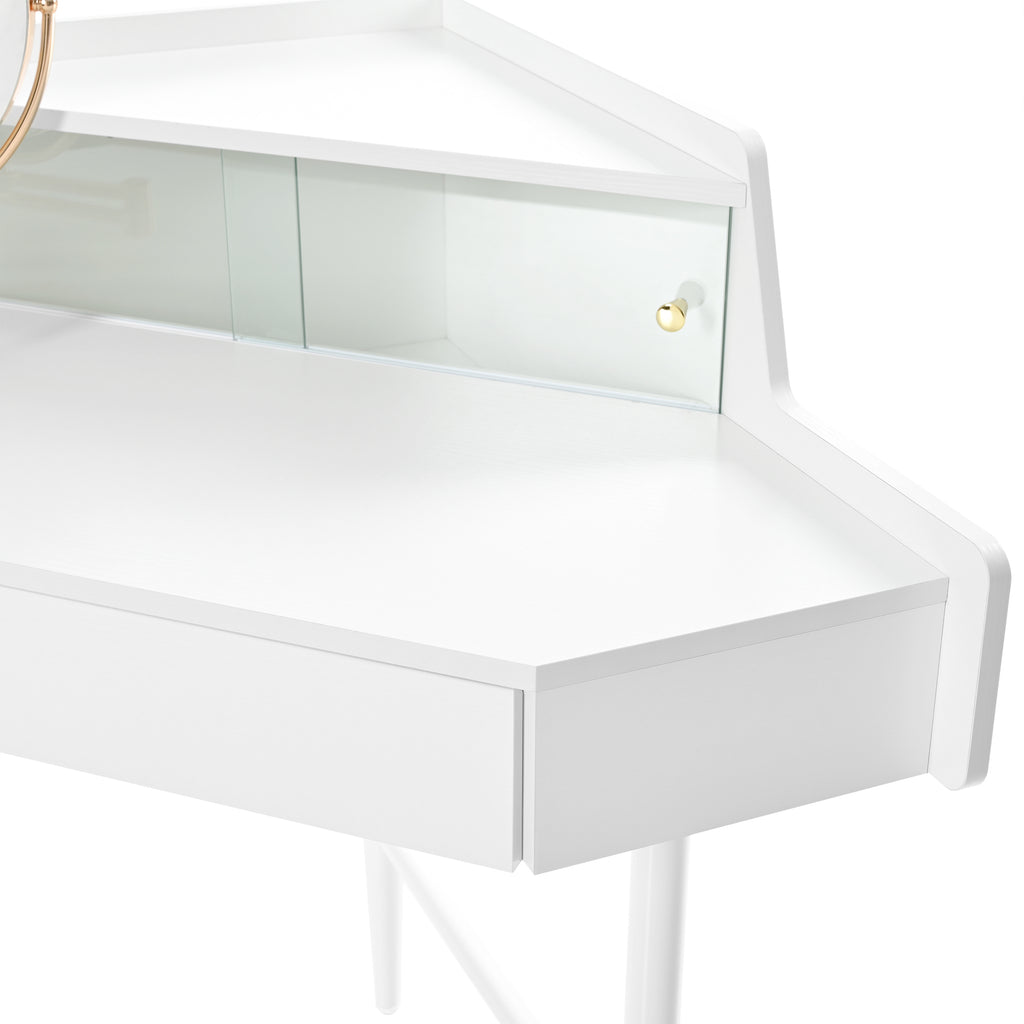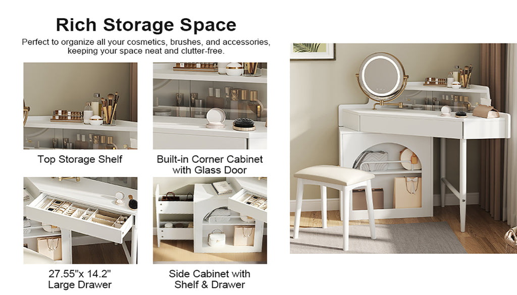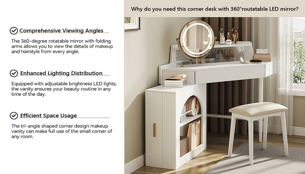 - Space-Saving Corner Design: Perfectly designed to fit snugly into the corner of your bedroom or bathroom, this vanity makes the most of small spaces. Its compact footprint saves valuable room area without compromising functionality.
