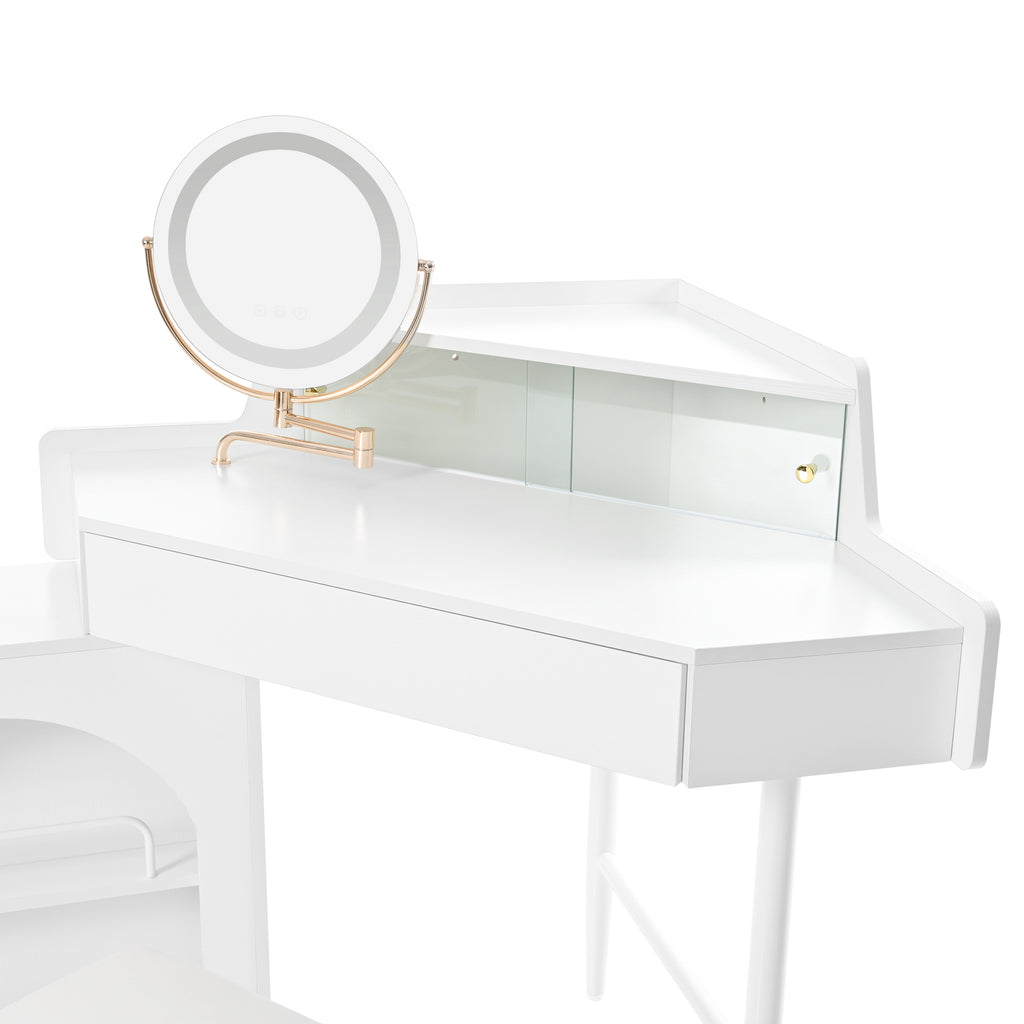 The L shaped corner vanity table is designed to fit the corner of your room, making full use of the limited space of the bedroom, batchroom or dressing room. And the detailed craftsmanship is both good looking and user friendly.