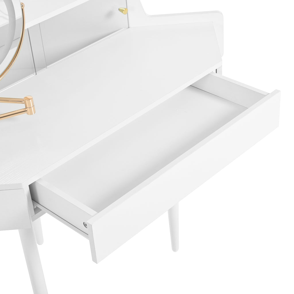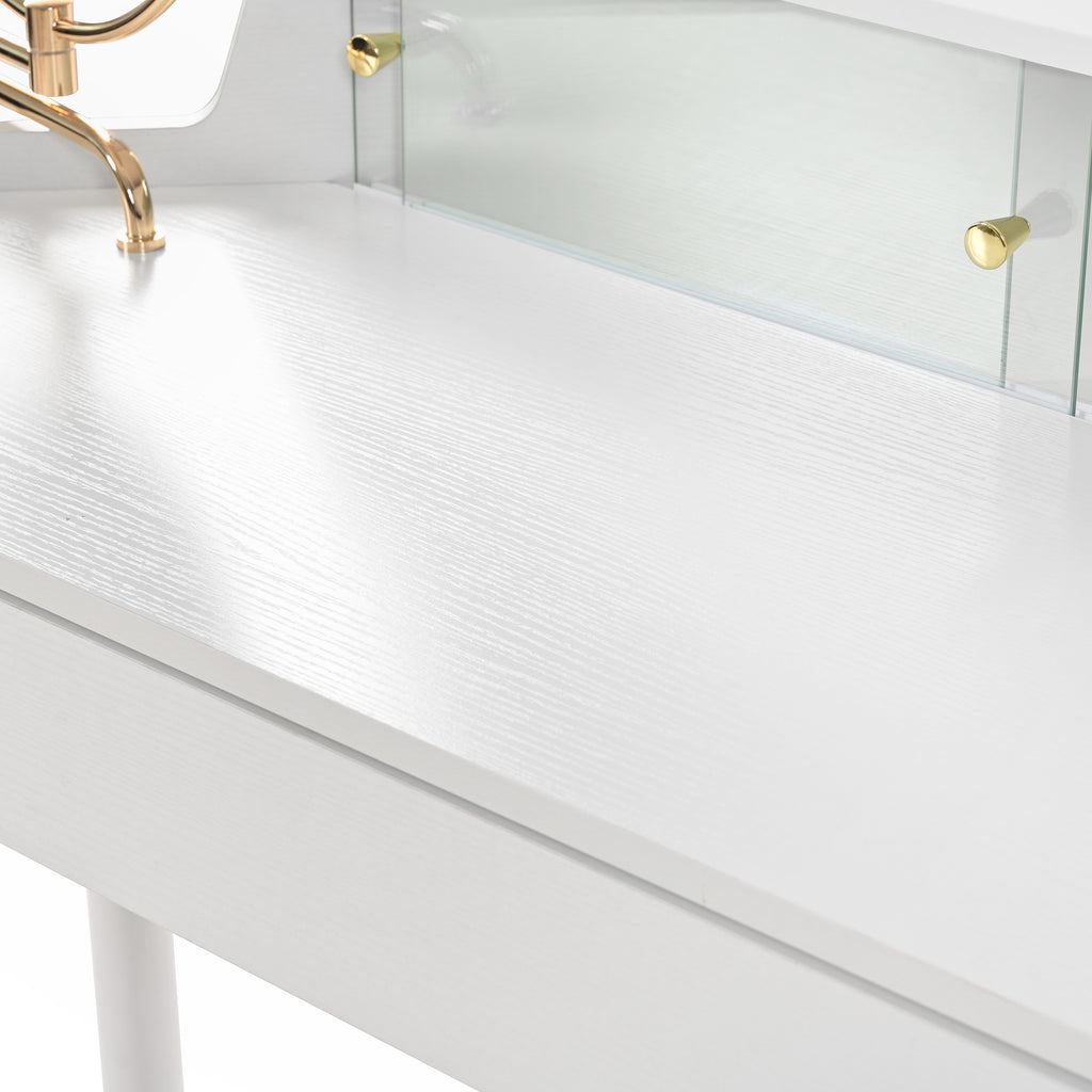 The side cabinet of the dressing table can be freely pushed in or pulled out, allowing it to adapt to small corner spaces. It features a two-tier drawer and an arched, two-tier open shelf, for the storage of cosmetics and beauty tools, within easy reach.