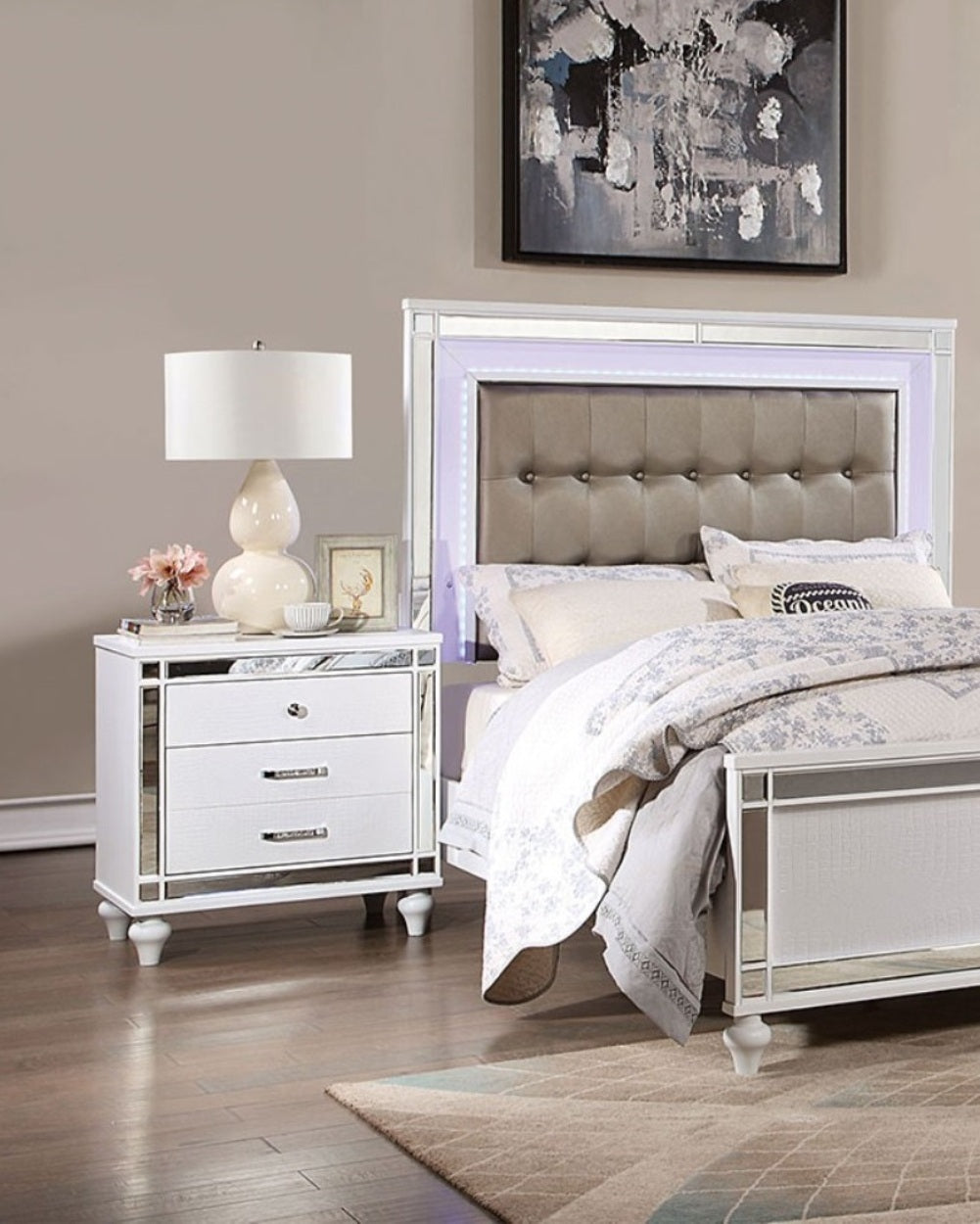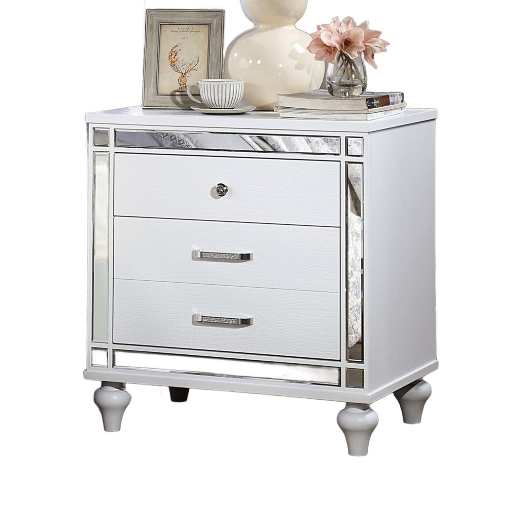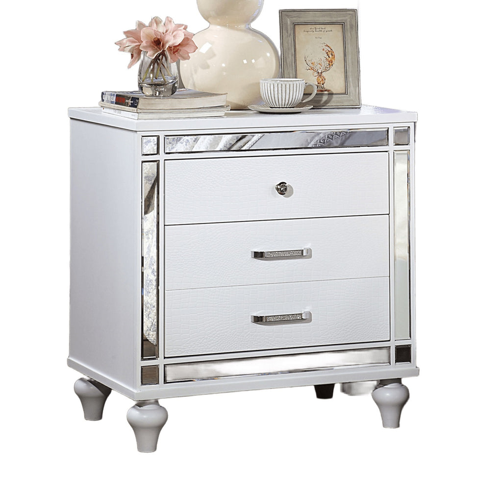 Get the most out of your bedroom with this contemporary style night stand. The decorative mirror accents and ornate bun feet along with the felt-lined top drawers blend traditional elements as well..