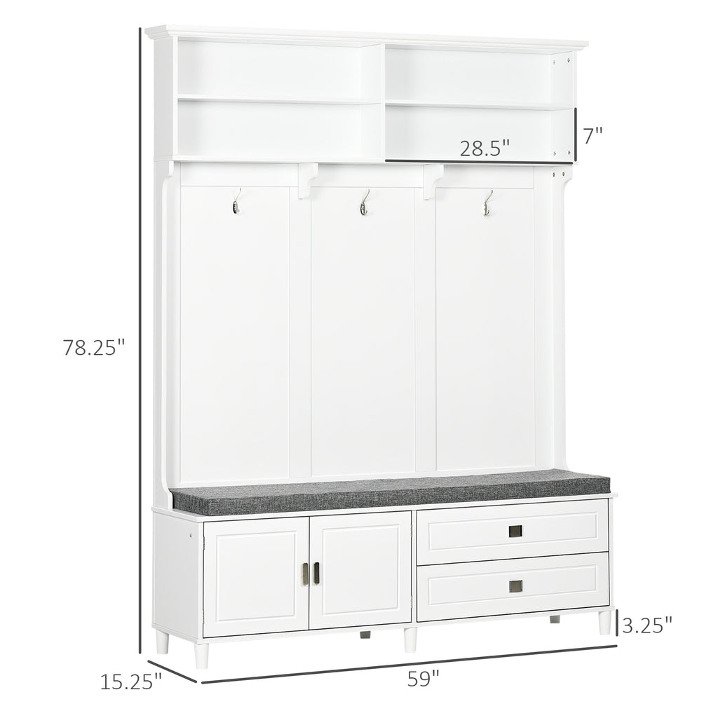 - COAT TREE INFORMATION: Overall Dimensions: 59' W x 15.25' D x 78.25' H, Weight Capacity: 572 lbs. (whole), 528 lbs. (bench), 6.6 lbs. (top shelf), 4.4 lbs. (drawer), 11 lbs. (bottom shelf). Assembly required.