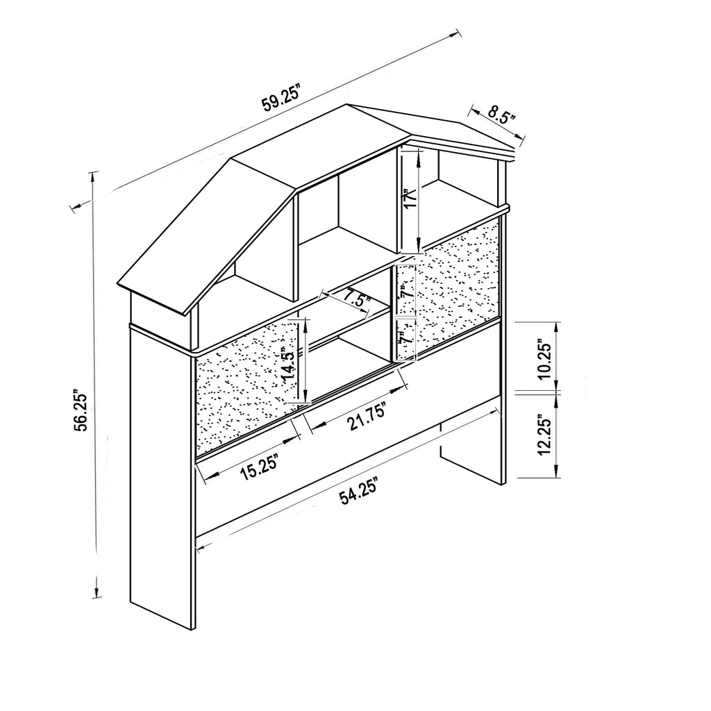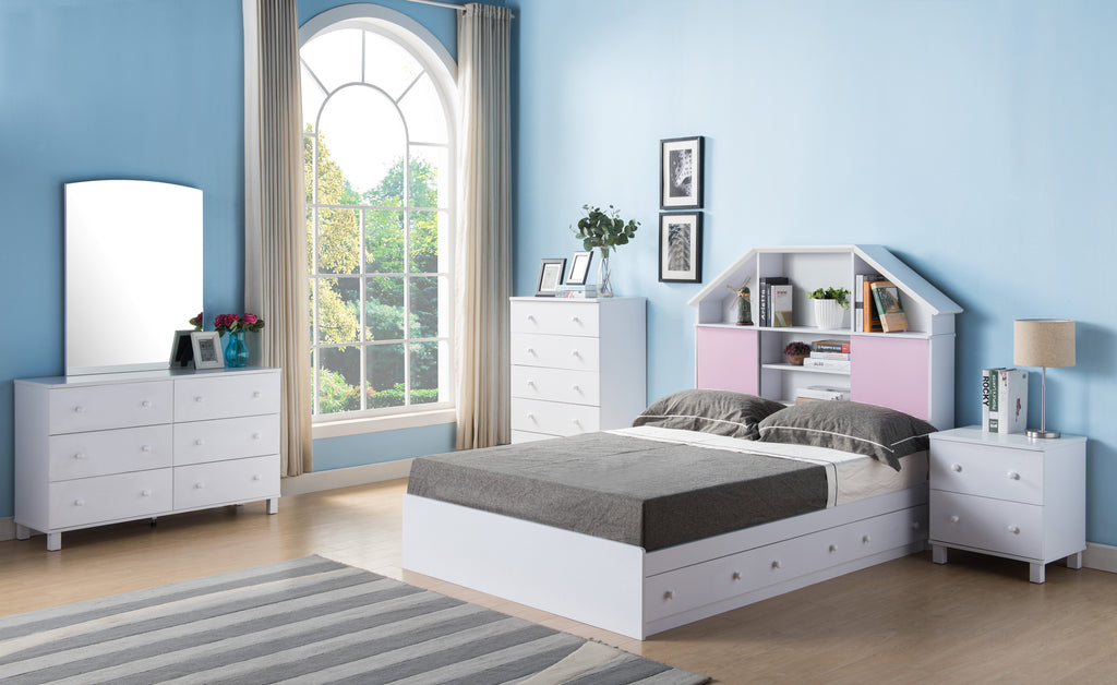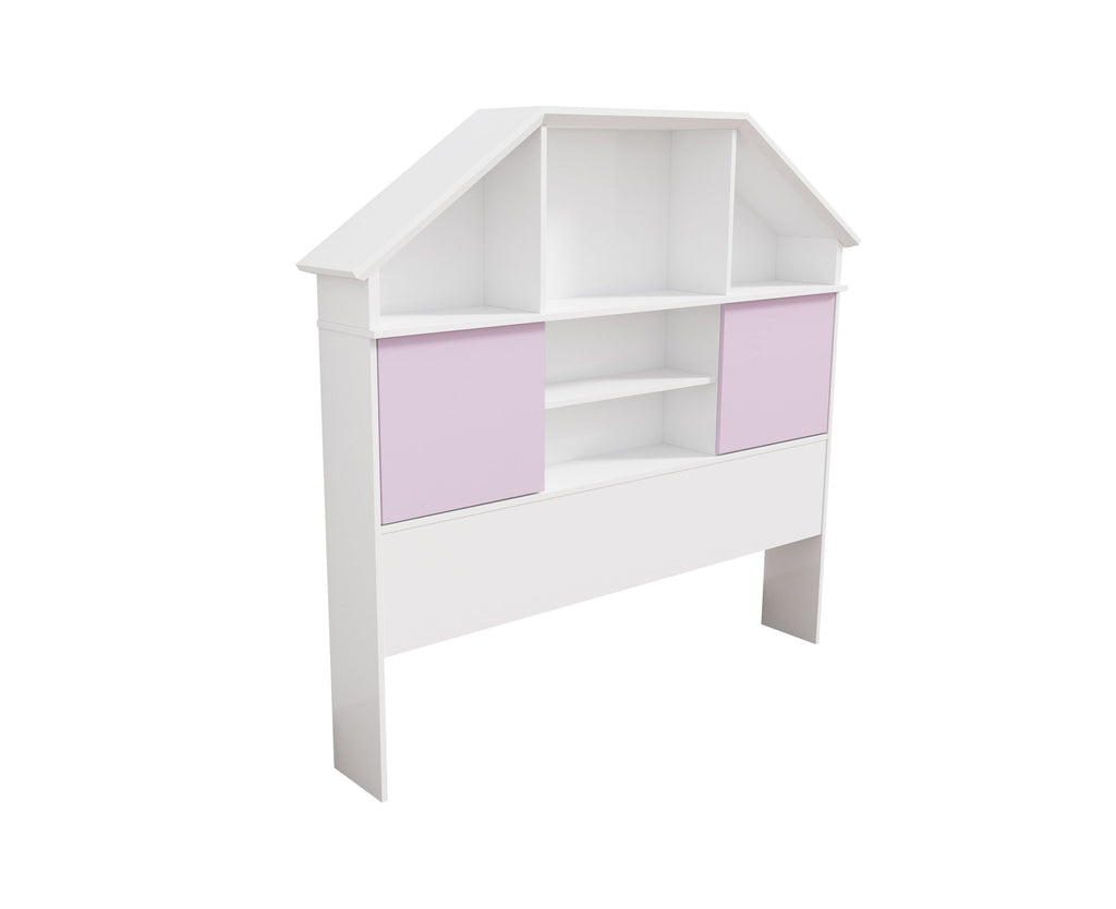 This full size bookcase has an additional shelf designed to look like a whimsical cottage home finished in a white melamine laminate with faux stamped wood grain for texture that minimizes scratching. Featuring two sliding pink color doors, seven cubby shelves provide lots of space for displaying picture frames, figurines and books. The top panel can be used as a shelf as well. The headboard is free standing. A full width panel behind the pillow space adds structure stability and minimizes dust.