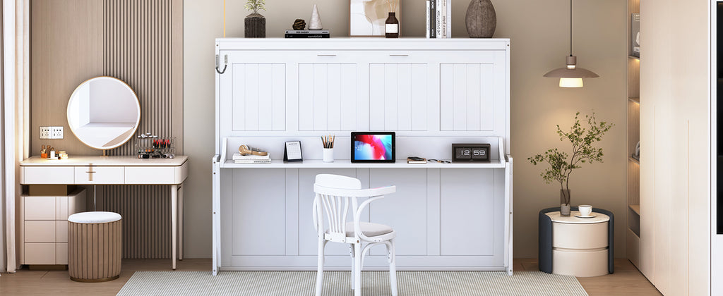 Maximize your living space with this innovative Full/Queen Wall Murphy Bed, seamlessly combining a bed and desk with hydraulic folding for ultimate convenience. Crafted from durable wood, it supports up to 600 lbs, offering reliable comfort and a sleek, space-saving solution for any room. Choose between washed white or gray to perfectly complement your decor, making tidiness effortless with built-in mattress storage.