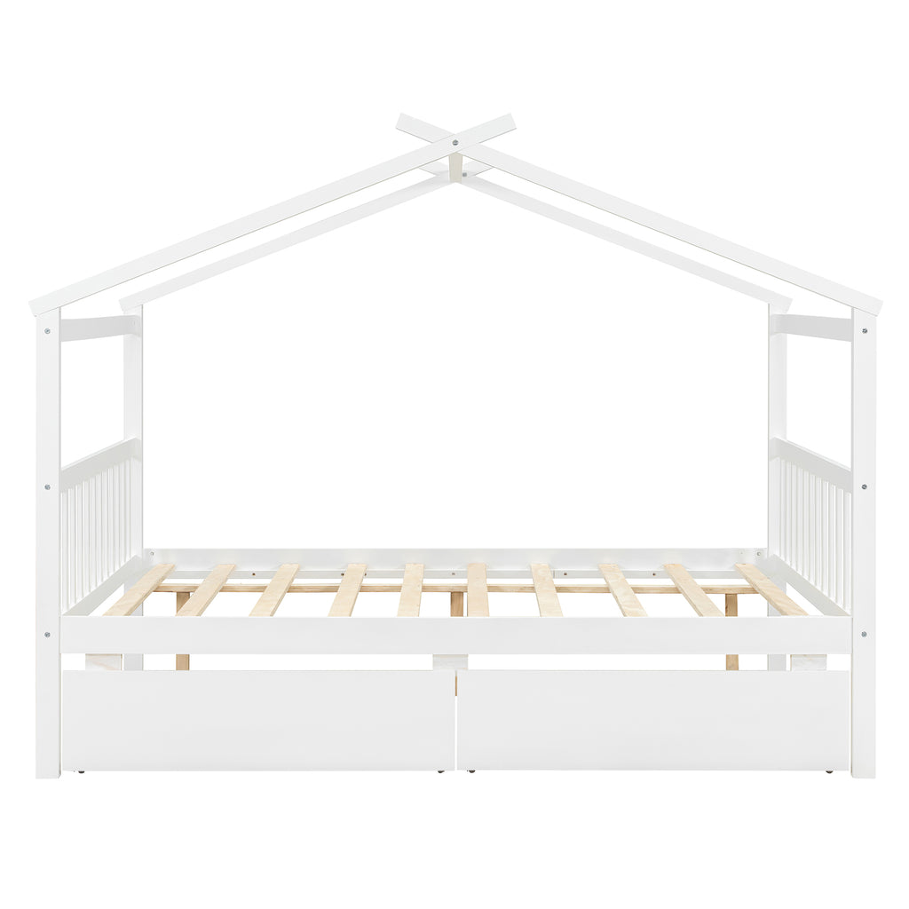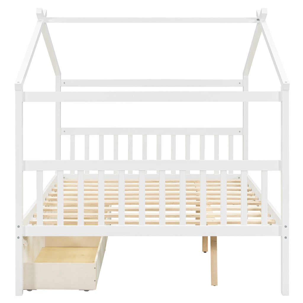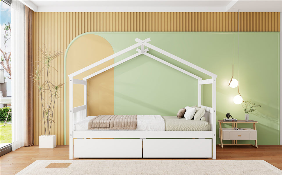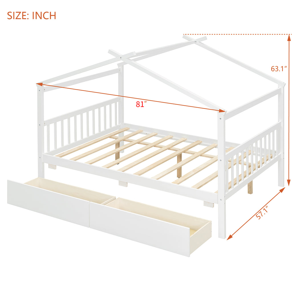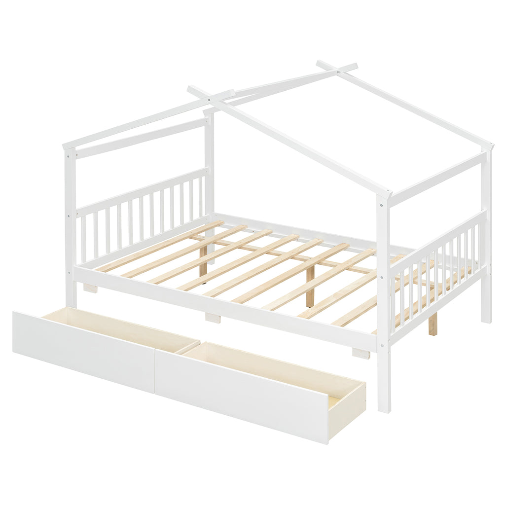 Transform your child's room with this charming Full Size White Wooden House Bed, featuring a whimsical sky roof design perfect for imaginative play. Crafted from solid pine wood with a durable frame, it includes two spacious storage drawers to keep their space tidy and organized. This imaginative and sturdy house bed offers a cozy, personalized sleep environment that parents and kids will adore.
