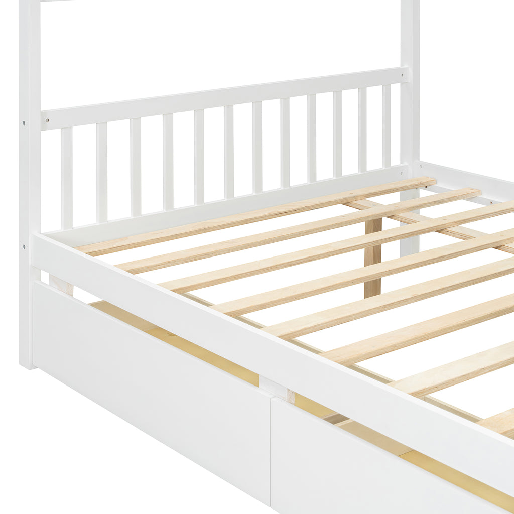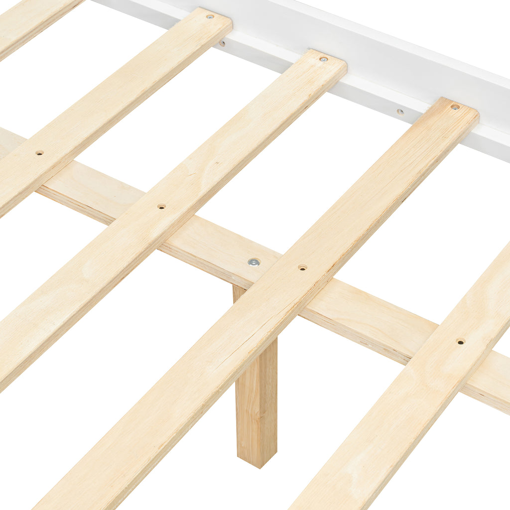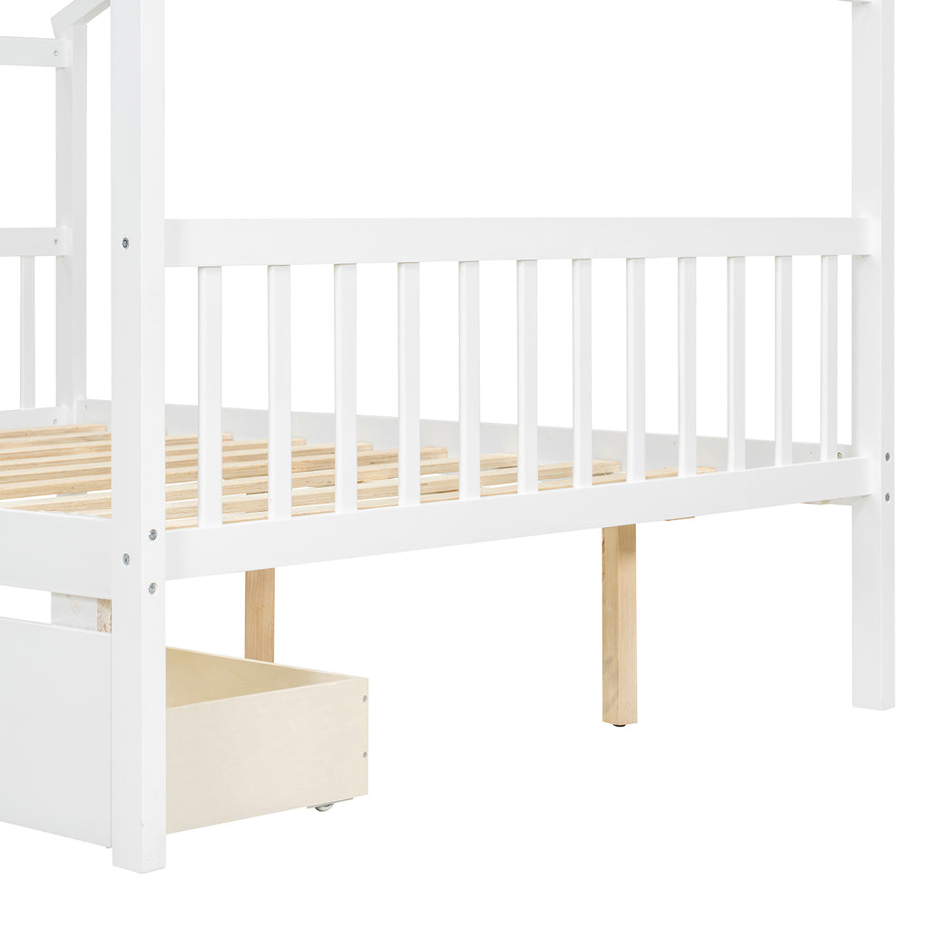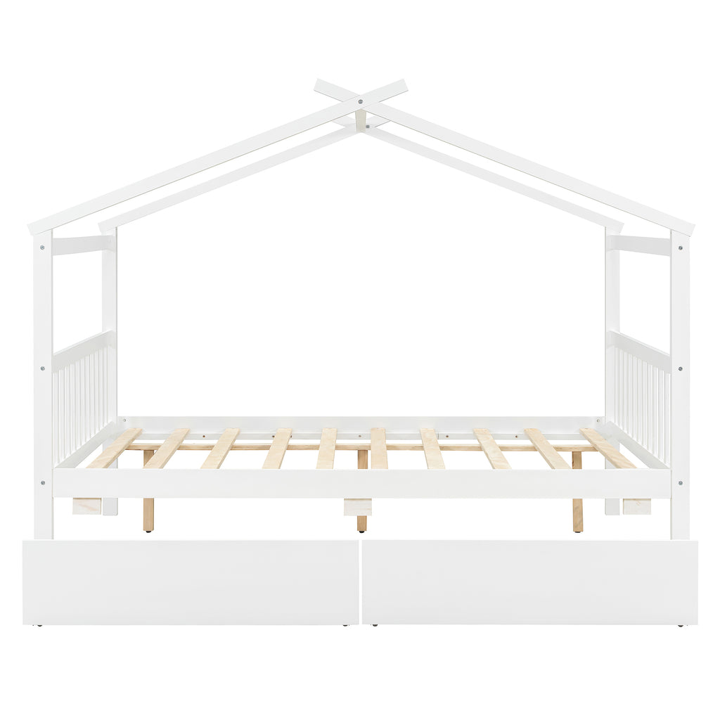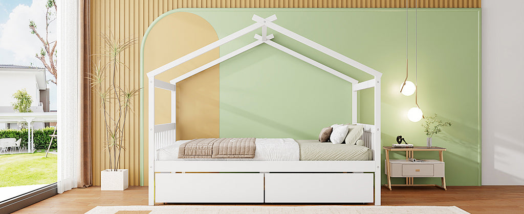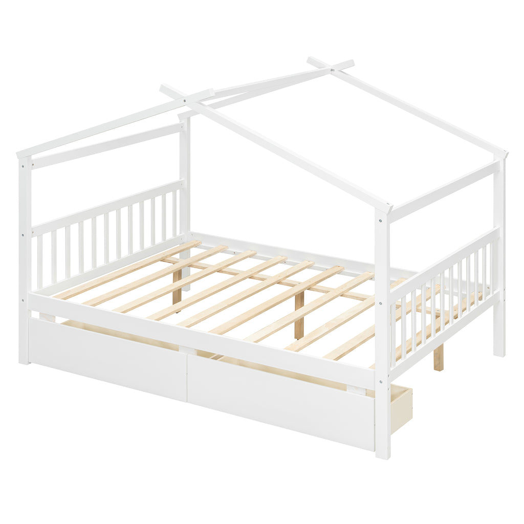Transform your child's room with this charming Full Size White Wooden House Bed, featuring a whimsical sky roof design perfect for imaginative play. Crafted from solid pine wood with a durable frame, it includes two spacious storage drawers to keep their space tidy and organized. This imaginative and sturdy house bed offers a cozy, personalized sleep environment that parents and kids will adore.