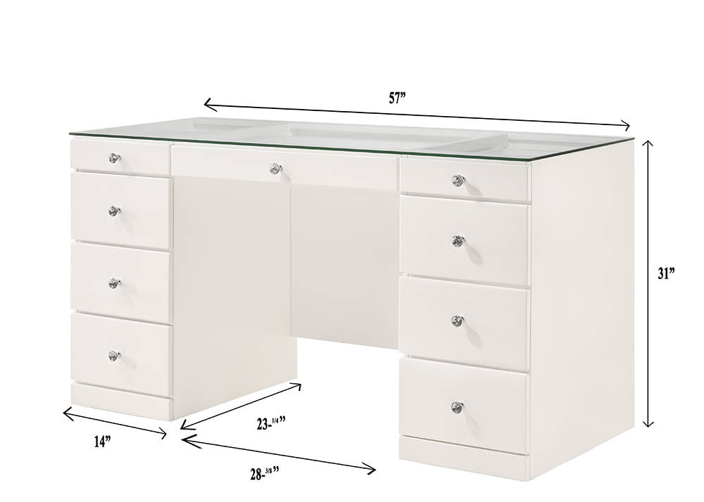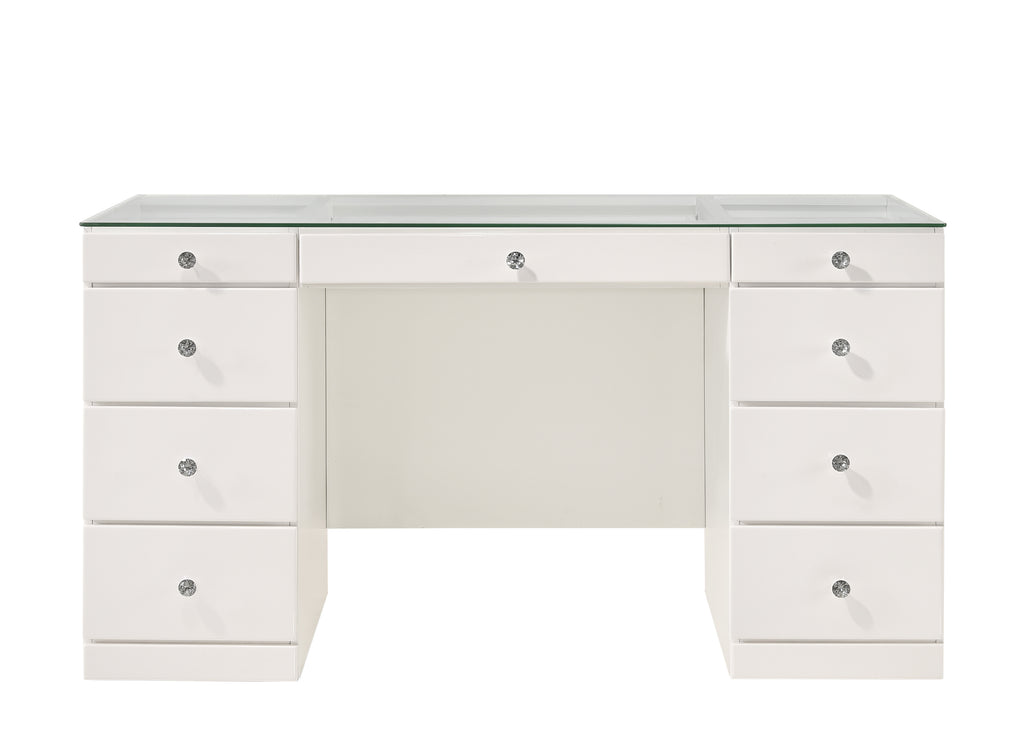 This Vanity features a white finish, a glass top and 9 drawers with knobs. It is a perfect addition to your bedroom suite.