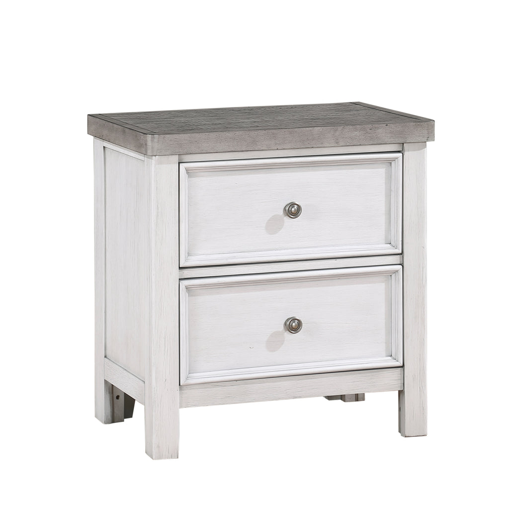 Hints of rustic styling permeate the transitional design of the Ambrose Collection, each subtle accent building to create a classic look for your bedroom. Antique White and Antique Gray finishes highlight the acacia veneer, their hues providing perfect complement to each other. The knob hardware that fronts each drawer of the nightstand is finished in antique pewter.