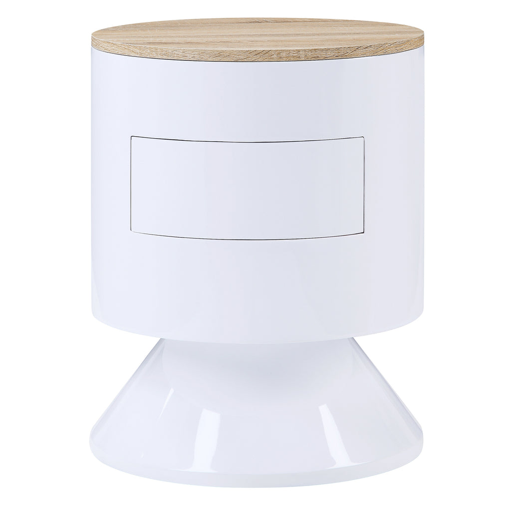 This nightstand boasts a glossy white finish, imparting a sleek and contemporary appearance to your bedroom, while its single drawer provides a compact storage option for keeping essentials organized and within reach. Equipped with a manual close mechanism, the drawer ensures smooth and controlled movement for convenient usage, and its modern design showcases a distinctive drum shape, adding a touch of artistic flair and uniqueness to your space.