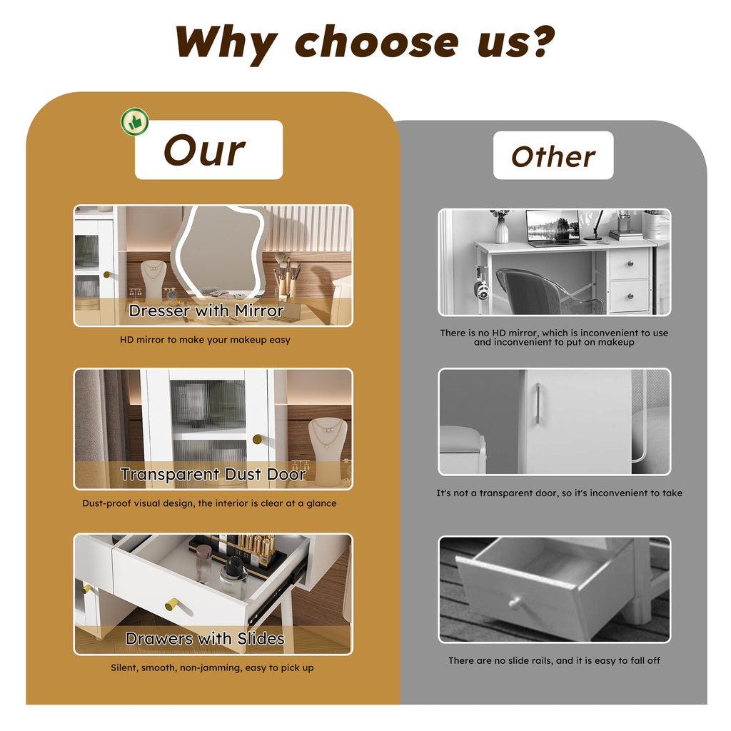 - Spacious & Organized Vanity: Measuring 39.3'L x 15.75'W x 48.82'H, this dressing table delivers massive storage with 3 drawers, 2 open shelves, and 4 hidden cabinets (with transparent doors). Perfectly organizes cosmetics, haircare tools, and jewelry—finally banishing countertop clutter while keeping essentials within easy reach.