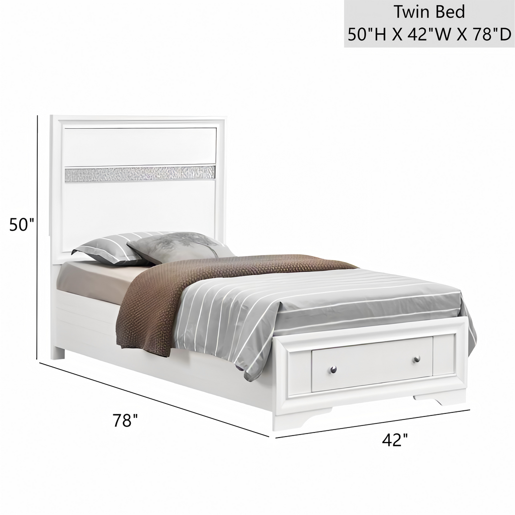- The elegant white laminate wood grain finish elevates the décor of your bedroom.