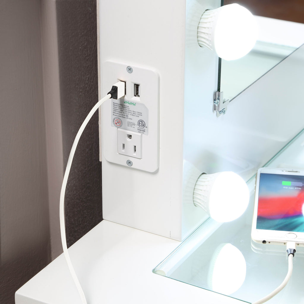 Elevate your daily beauty routine with our Makeup Vanity in pristine white. This versatile and elegant piece is designed to enhance your space while providing the functionality you need. Equipped with 10 lights for optimal illumination, a built-in USB and power outlet for convenient charging, and a comfortable matching stool, this makeup vanity is a must-have addition to your bedroom or dressing area. The sleek white finish adds a touch of modern sophistication, while the spacious drawers offer ample storage for your beauty essentials. Experience the perfect blend of style and practicality with our Makeup Vanity, designed to make your beauty rituals a truly enjoyable and luxurious experience.