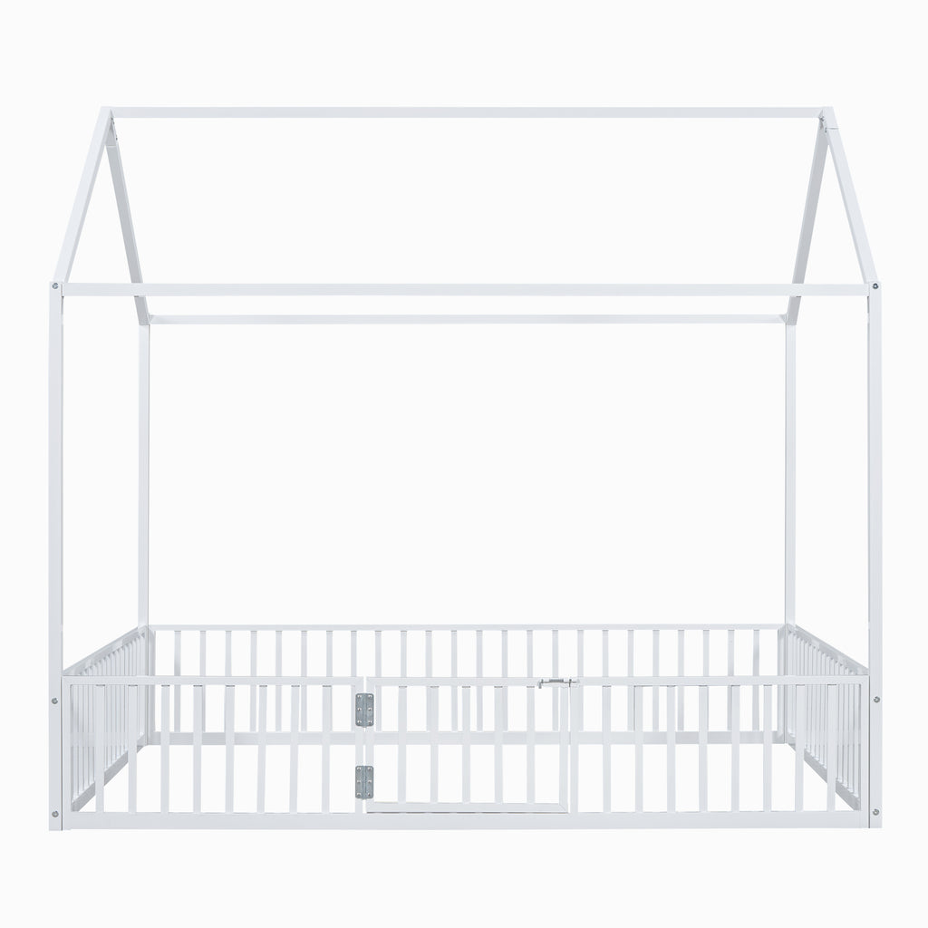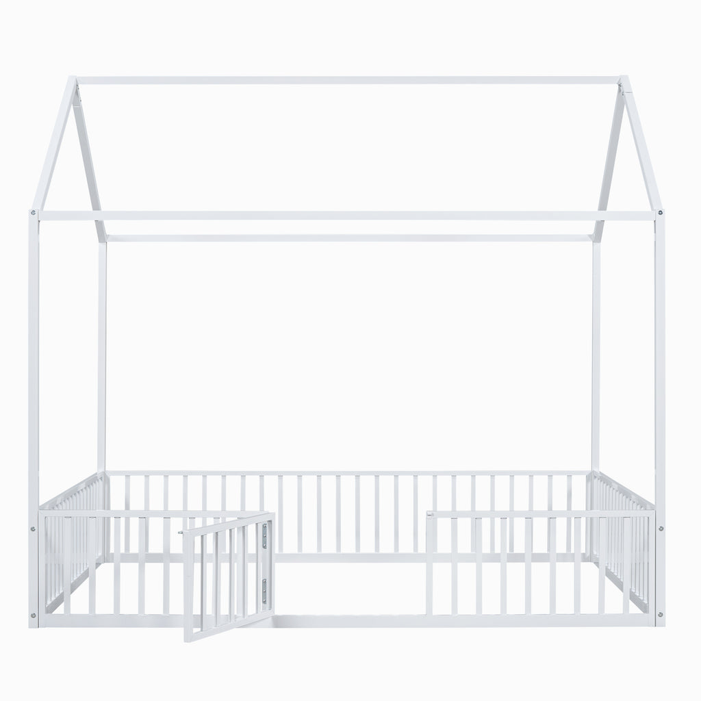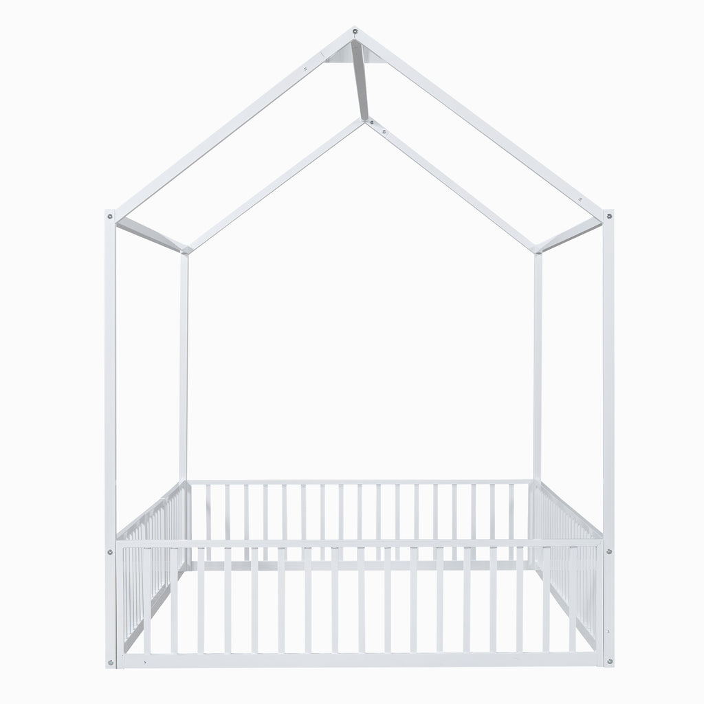 Transform your child's room with this enchanting Twin Metal House Bed, featuring a whimsical roof, unique distressed white wash, and a fun fence with a functional door. Its imaginative house-shaped design creates a delightful play haven, fostering creativity and adventurous dreams. This sturdy metal bed provides a secure and inspiring space perfect for endless exploration and restful sleep.