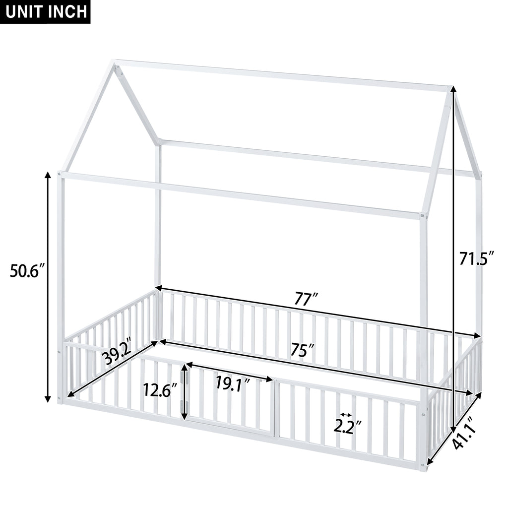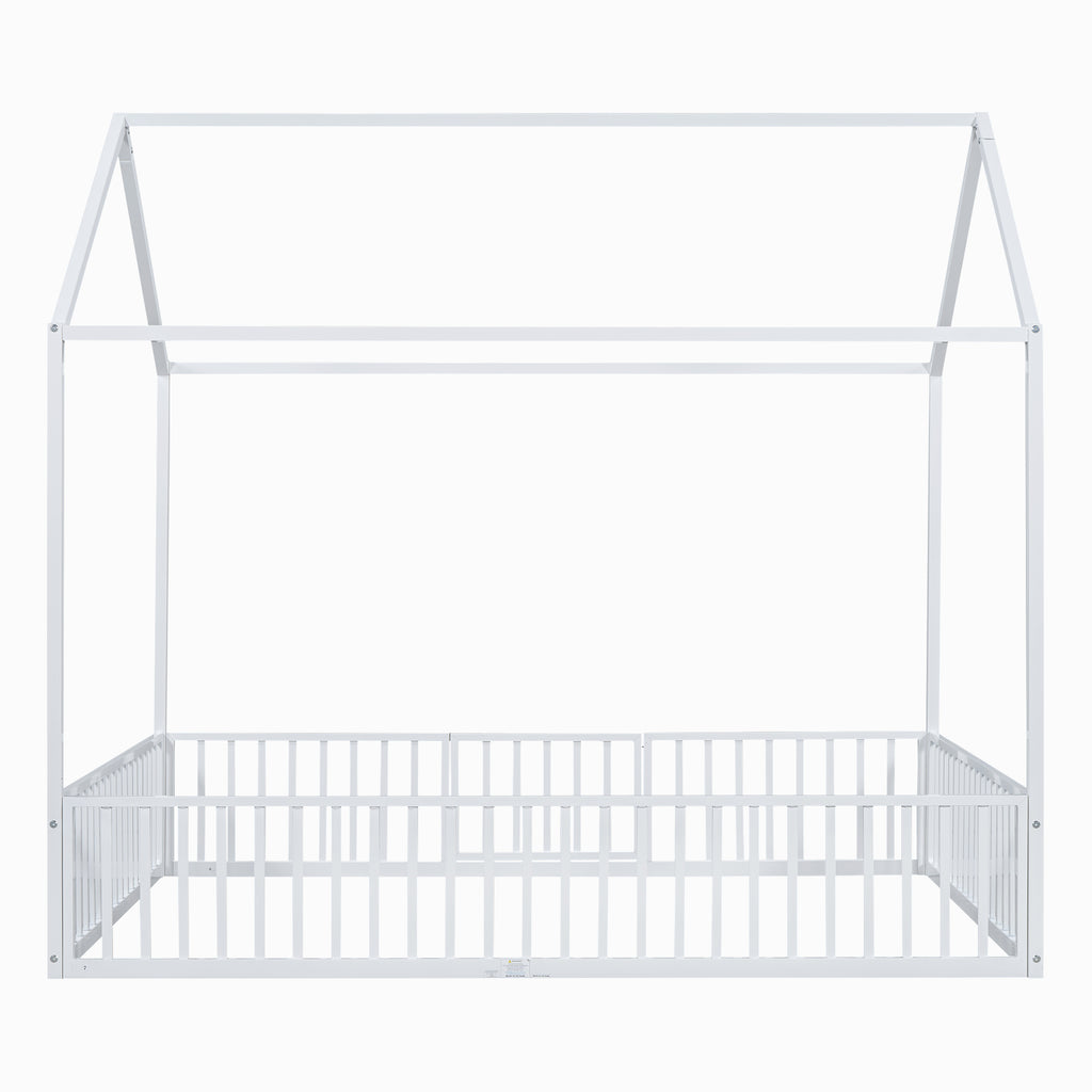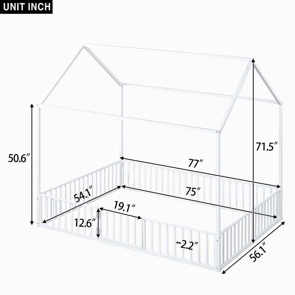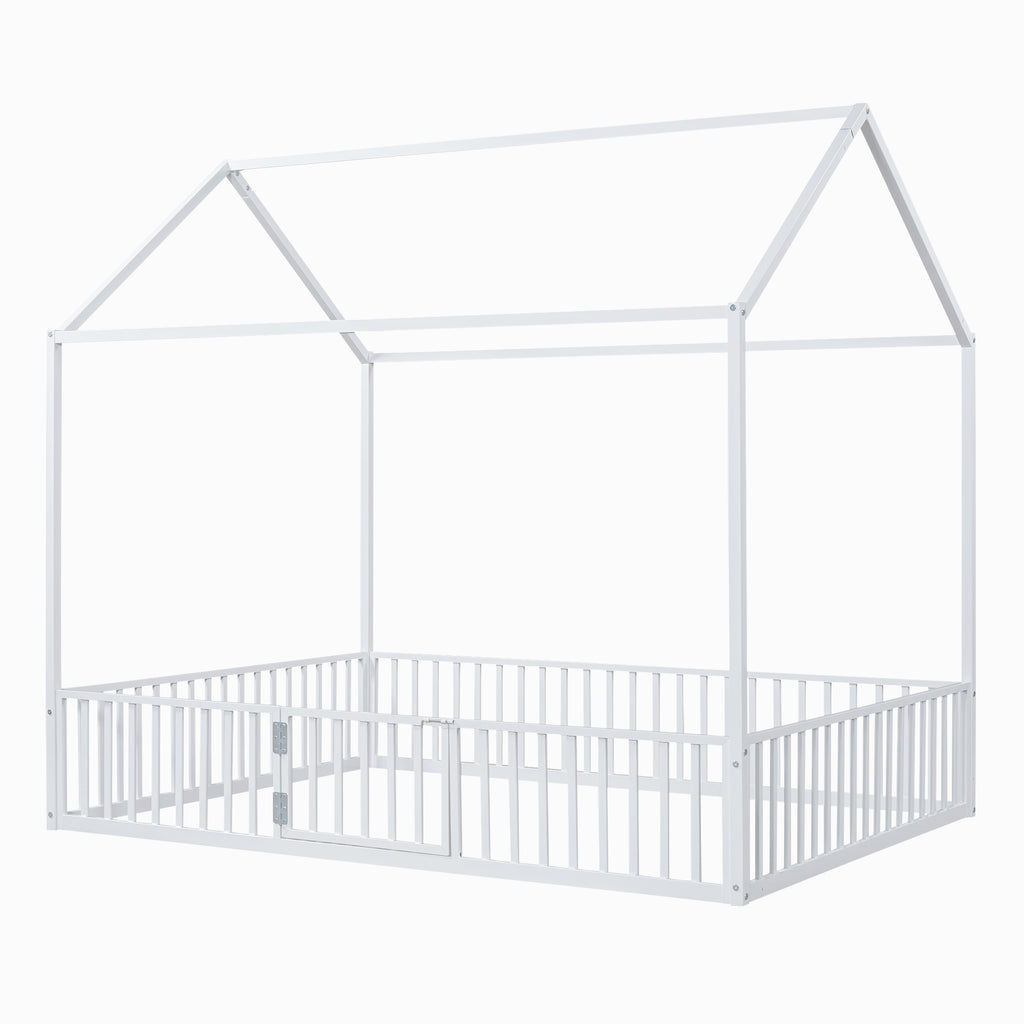 Transform your child's room with this enchanting Twin Metal House Bed, featuring a whimsical roof, unique distressed white wash, and a fun fence with a functional door. Its imaginative house-shaped design creates a delightful play haven, fostering creativity and adventurous dreams. This sturdy metal bed provides a secure and inspiring space perfect for endless exploration and restful sleep.