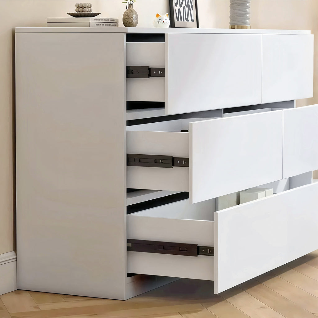 - {Large Storage Space} This 6 drawer white dresser is equipped with 6 large storage drawers. Whether it is seasonal clothing, children's toys, collections of books, or all kinds of personal belongings, they can be easily stored, making the home neat and tidy in an instant. The wide top table is an ideal place to display photo frames, vases, and art ornaments. It can also be flexibly transformed into a TV cabinet to meet diverse needs.