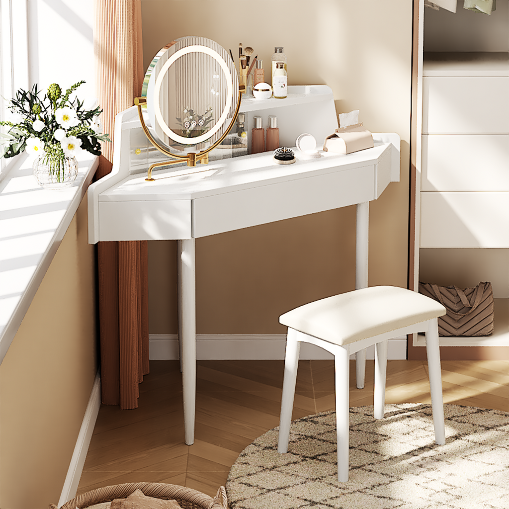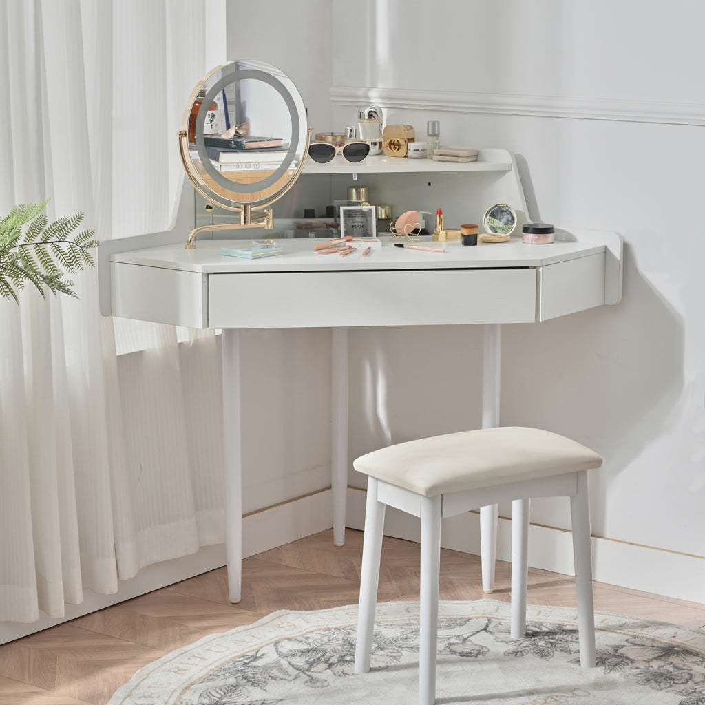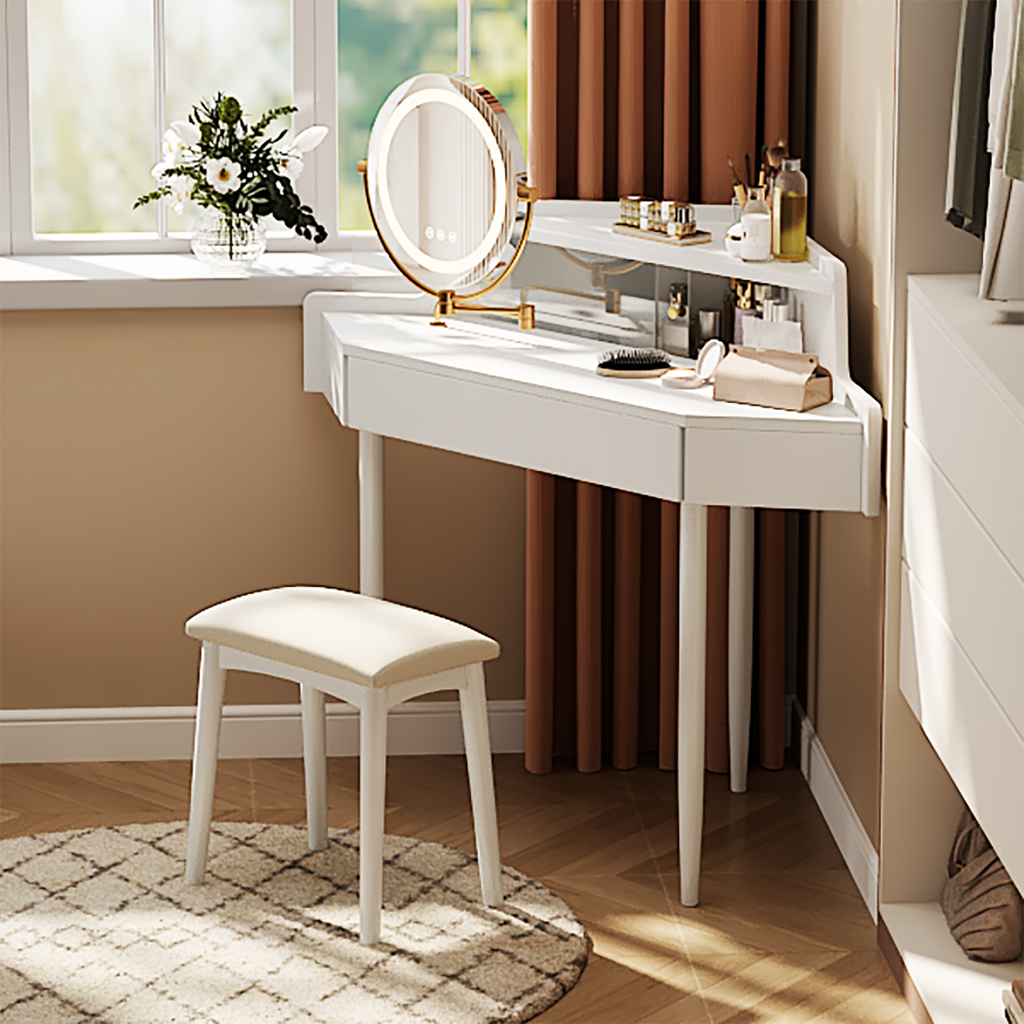 The corner vanity table is designed to fit the corner of your room, making full use of the limited space of the bedroom, batchroom or dressing room.