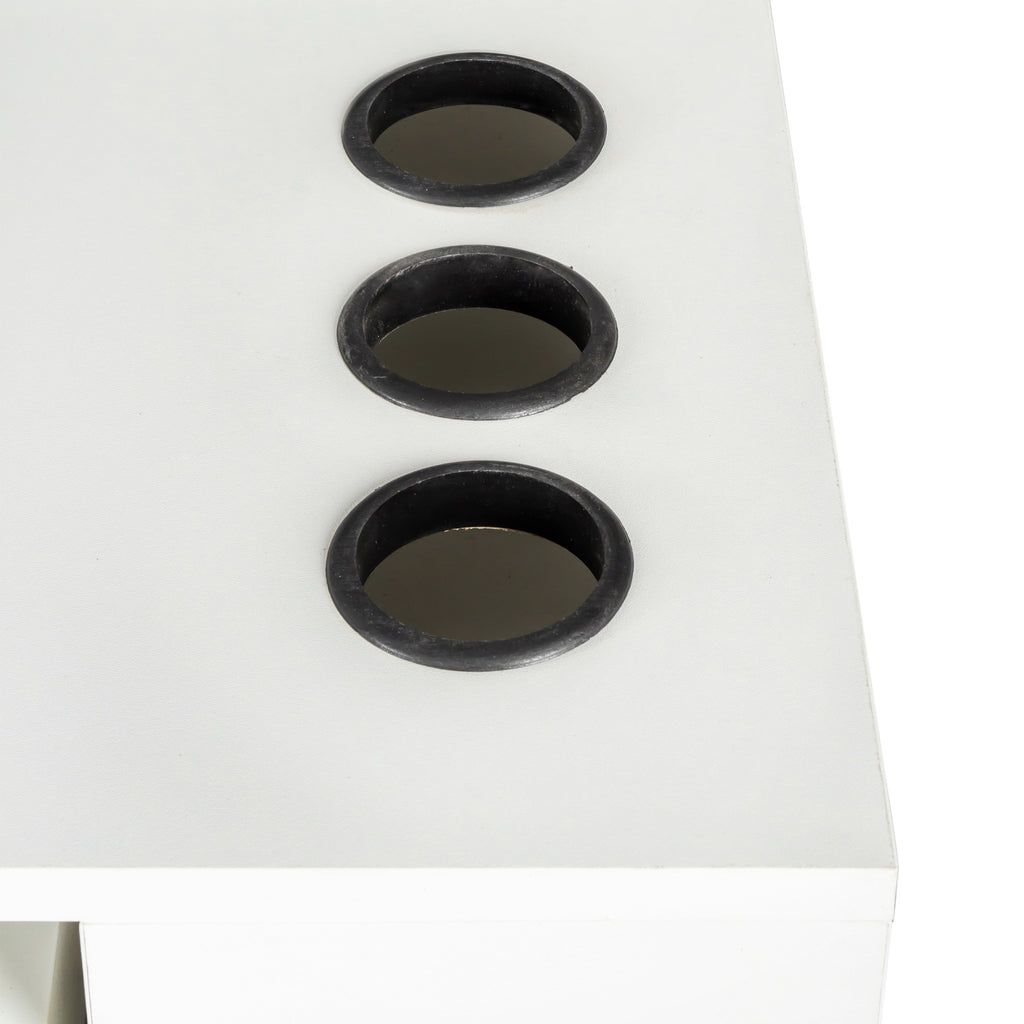 - Two enclosed drawers and a large cabinet add storage space for a variety of items and remove clutter from the desk Table top with 3 round holes for hair dryer and other items