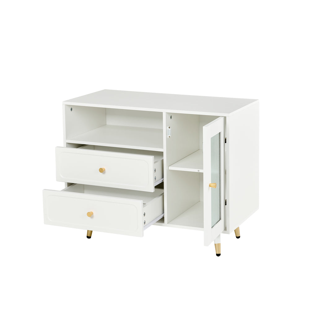 The canbinet door is equipped with semi-transparent striped glass, it obscures clutter while letting light through.