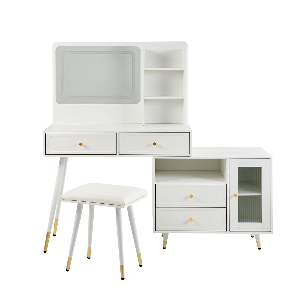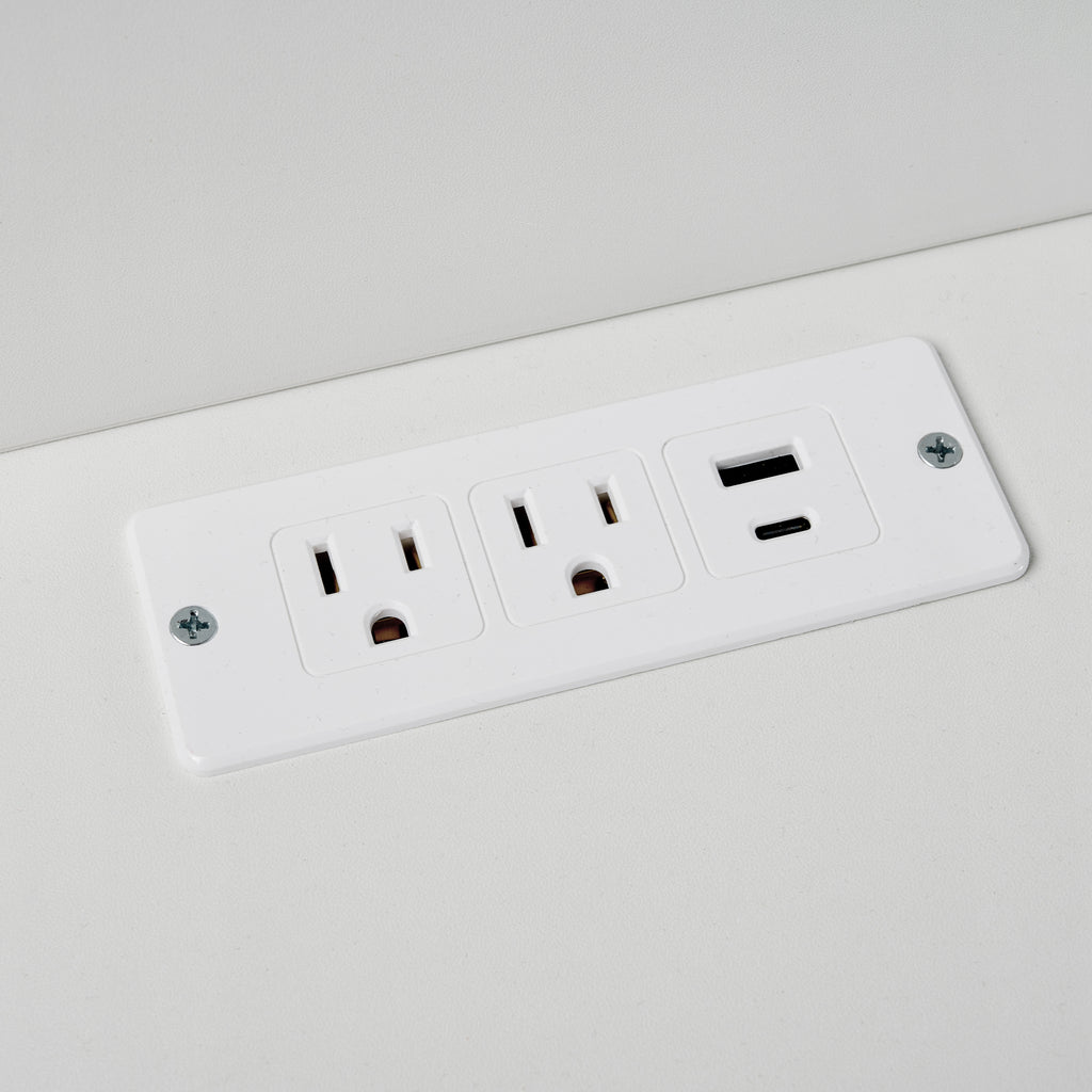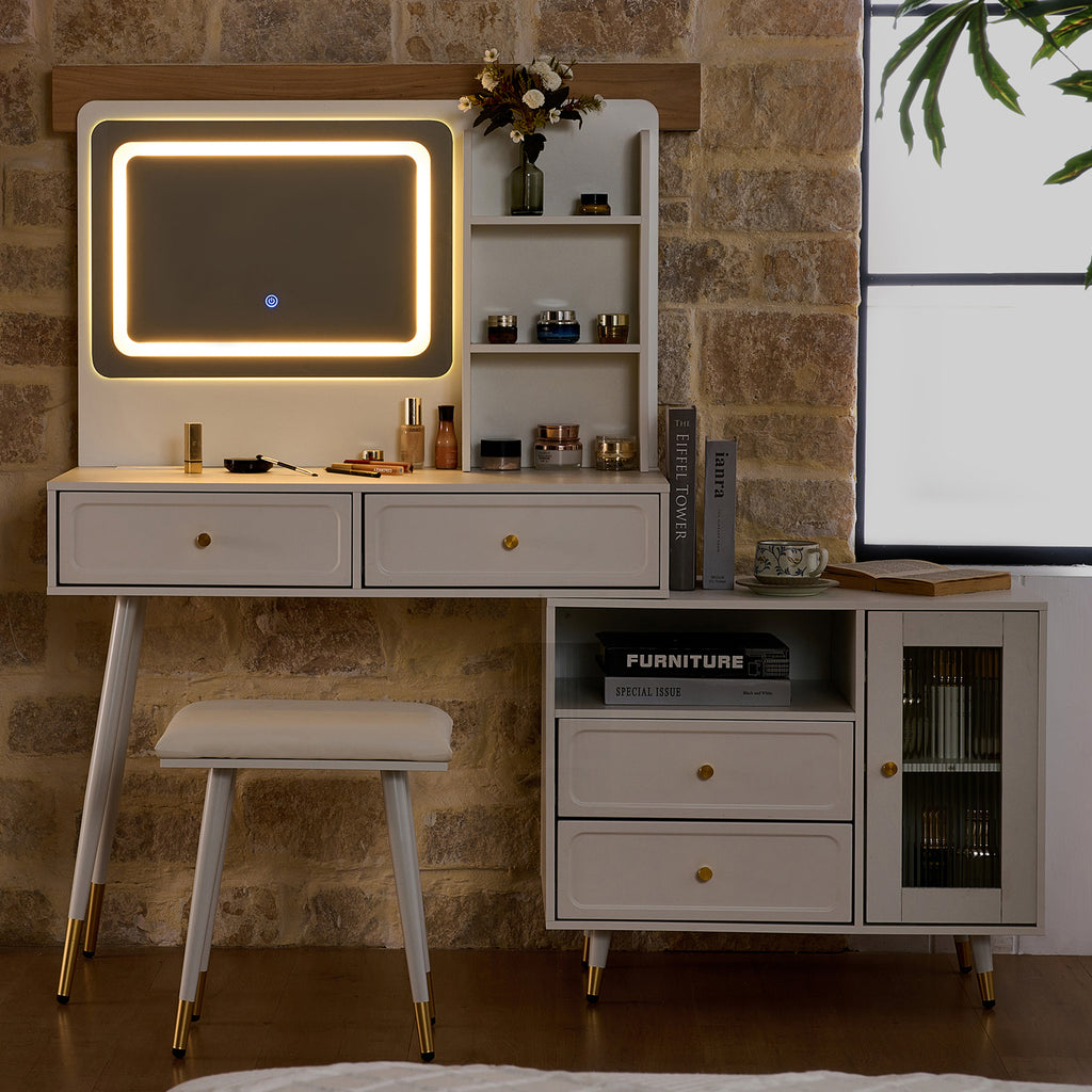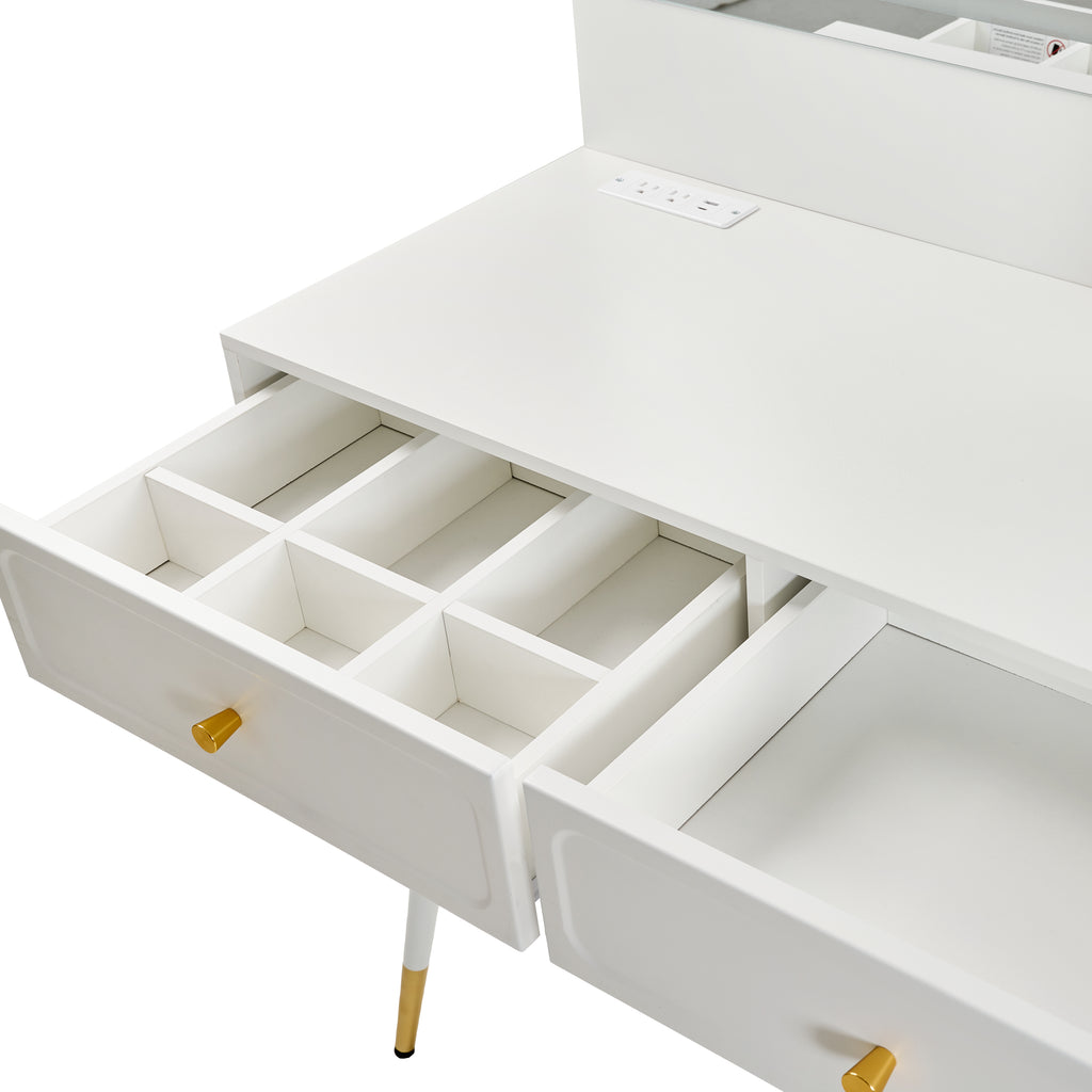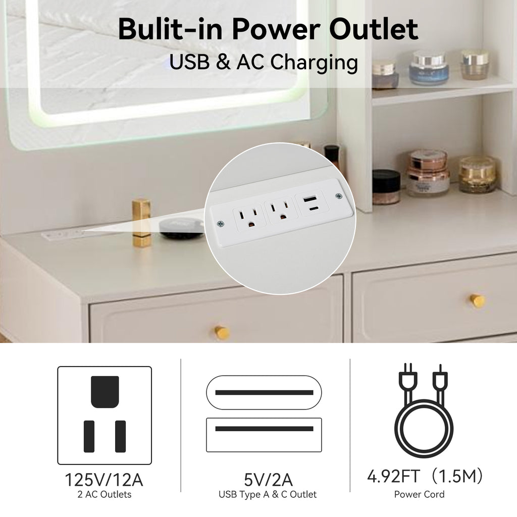 The dressing table has a built-in power station featuring 2 standard plug sockets, 1 USB port, and 1 T-C port, for easy charging for makeup electrical devices.