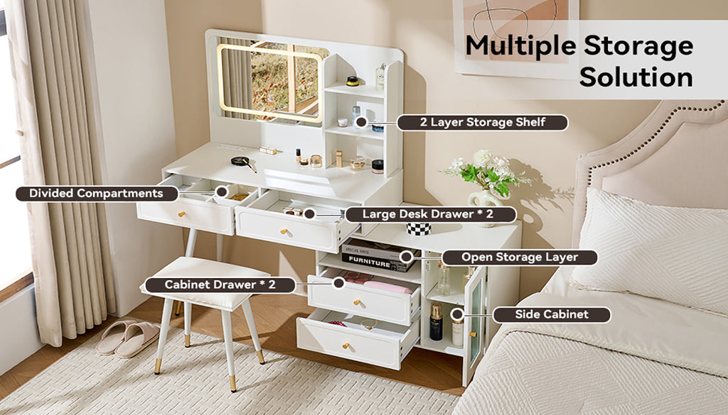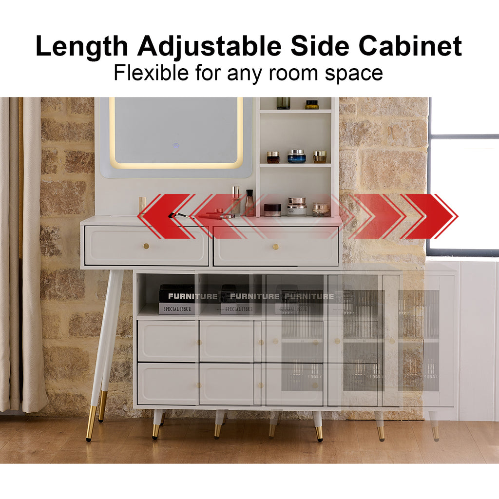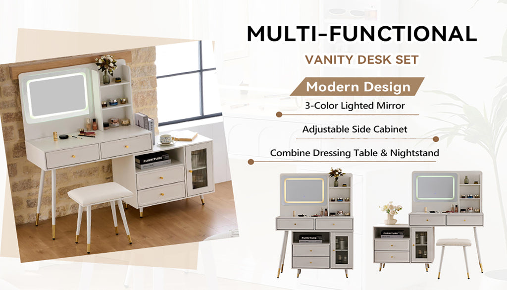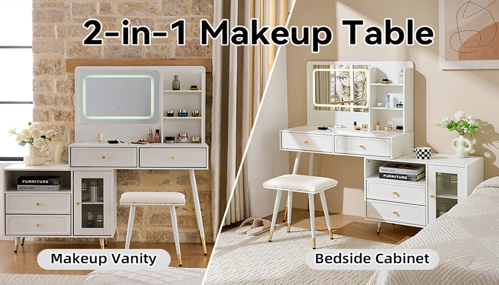 - Adjustable Cabinet and Length for Maximum Space Utilization: The total length of the Vanity Desk can be easily adjusted by moving the cabinet, and the position of the bedside table is interchangeable from left to right. This flexibility makes it perfect for optimizing space in bedrooms, dressing rooms, or any other small areas, ensuring it fits seamlessly into your living space.
