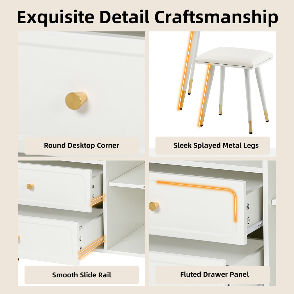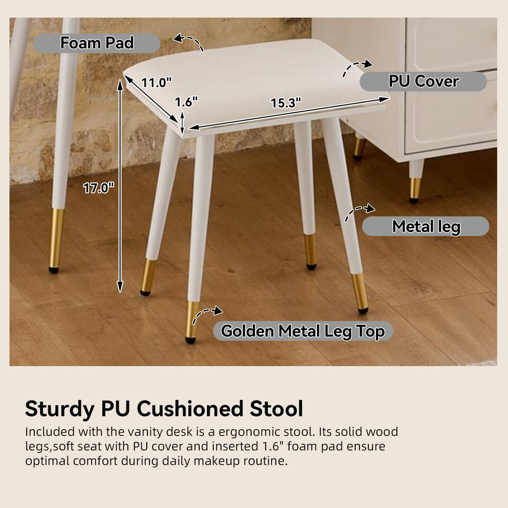 Included with the vanity desk is a ergonomic stool. its solid woodlegs, soft seat with PU cover and inserted 1.6' foam pad ensureoptimal comfort during daily makeup routine.
