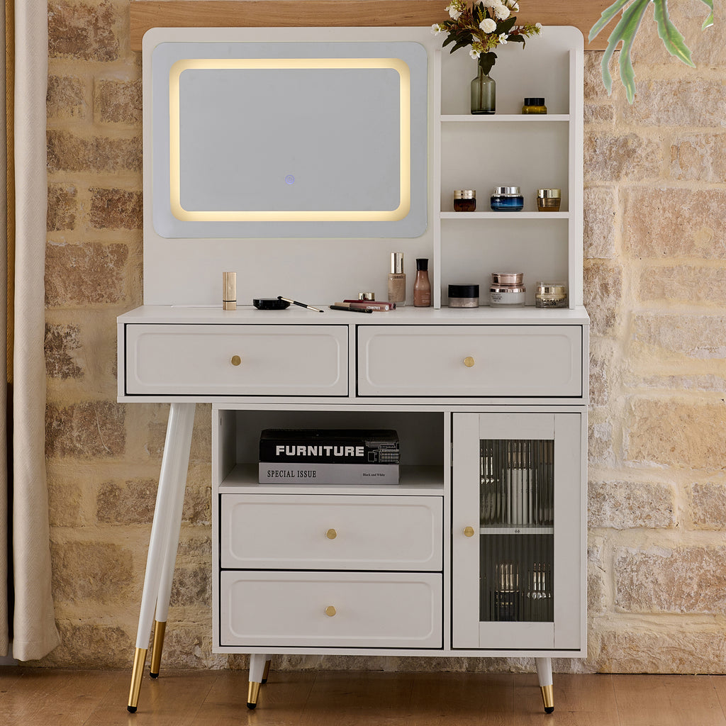 - Large Mirror with 3-Color LED Lights for Perfect Lighting: The dresser features a high-definition mirror with 3 lighting modes—natural, warm, and cold light. With just a press of the switch on the mirror, you can effortlessly switch between these modes. The adjustable brightness allows you to customize the lighting to your preference, making it ideal for any lighting condition, whether for morning makeup or evening touch-ups.