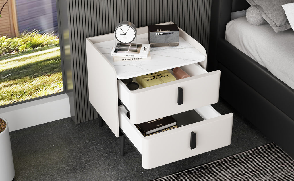 - 2.Nightstand with Marble-Pattern Tabletop: With its marble-pattern tabletop, this nightstand exudes a minimalist elegance that’s both simple and refined.